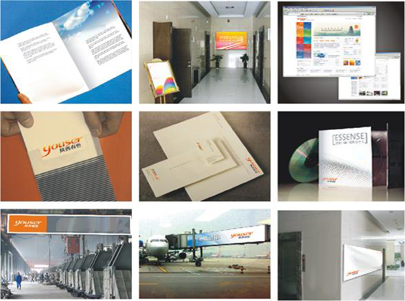 本部分展示了陜西有色的標志、輔助圖形、理念在實際中的應(yīng)用,其中包括:企業(yè)畫冊、品牌文化手冊、員工培訓(xùn)手冊、理念海報、明信片、邀請函、信紙、信封、名片、CD、包裝盒、室內(nèi)理念傳播、廠區(qū)理念傳播、戶外廣告、戶外理念海報、展覽展示、網(wǎng)站等。