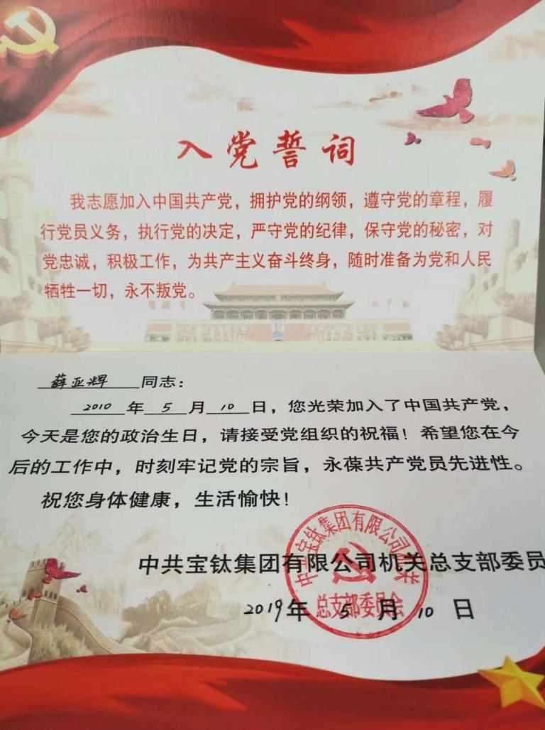 近日,寶鈦集團(tuán)機(jī)關(guān)黨總支開展為黨員過(guò)“政治生日”活動(dòng)。從5月份起,在黨員入黨日當(dāng)天,由機(jī)關(guān)黨支部向黨員贈(zèng)送“政治生日賀卡”,重溫入黨誓詞,開展談心談話?!罢紊召R卡”不僅印制了入黨誓詞、習(xí)近平總書記對(duì)黨員提出的“四講四有”的要求,還有機(jī)關(guān)總支的衷心祝福和殷切希望。
