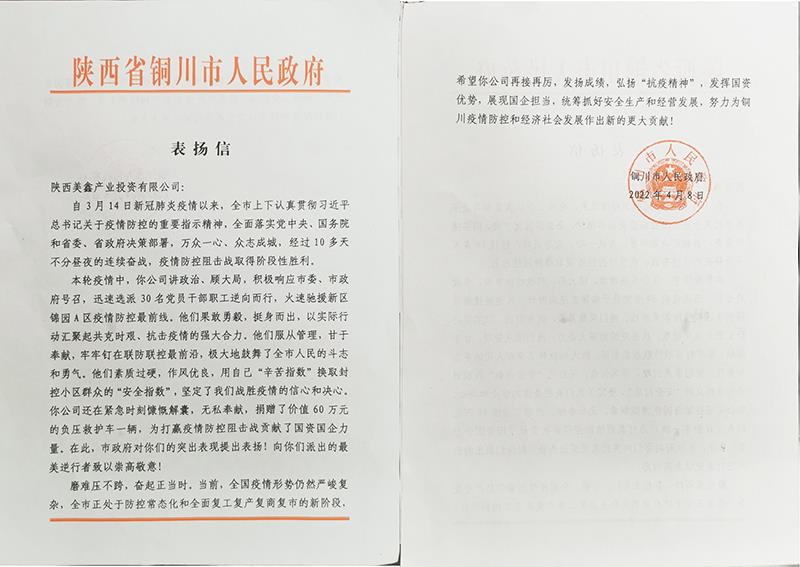 4月上旬,銅川市人民政府向陜西美鑫公司發(fā)來一封《表揚(yáng)信》,對該公司積極參與銅川市3.14疫情防控工作付出的努力和做出的貢獻(xiàn)表示高度的贊揚(yáng),對主動擔(dān)當(dāng)、勇于作為,防疫情、穩(wěn)生產(chǎn)取得的成績給予充分肯定。
