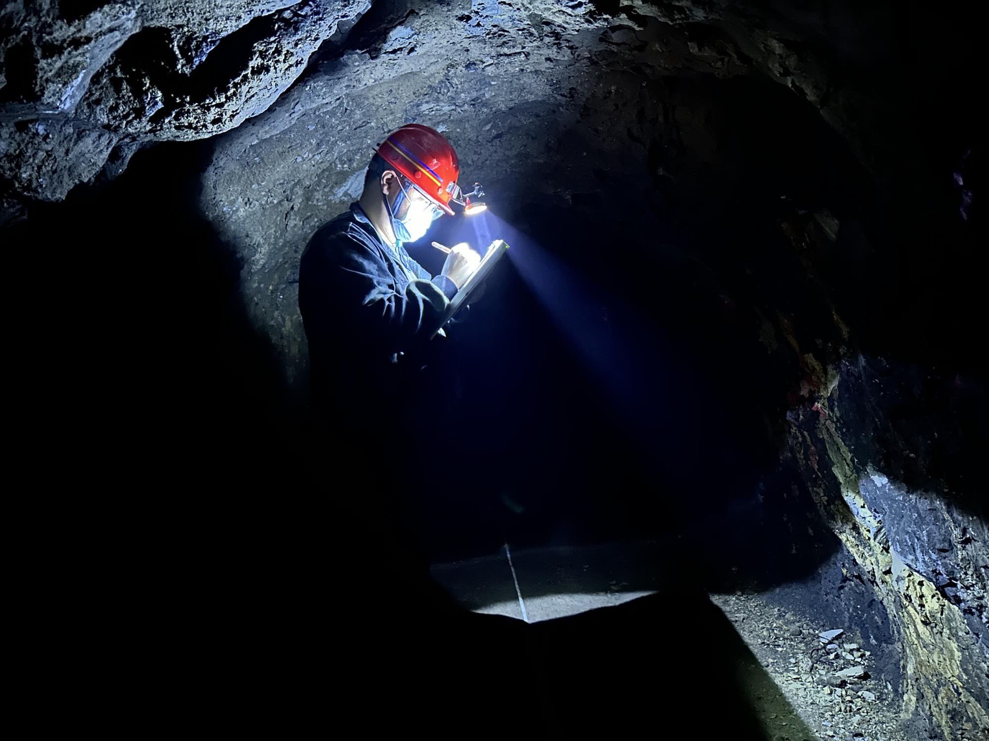 當(dāng)寨子溝礦區(qū)樣品送檢后,坑道成了我的另一個(gè)課堂。師父教我測(cè)量各類產(chǎn)狀,教我展點(diǎn)和產(chǎn)狀,教我如何勾畫地質(zhì)界線……水珠從坑道頂板滴落,在礦燈光束里拉出銀線。師父的筆尖在巖壁上游走如活物,筆尖順層理滑動(dòng),在圖紙上旋出流暢的曲線?;璋倒饩€下,那墨線竟有了生命般微微搏動(dòng)——巖石的密碼被解開一道縫隙,礦脈的暖流正滲出石壁。地質(zhì)錘叩擊巖壁的顫音未散,巖石紋層間簌簌剝落的碎屑里,恍有古河道裹挾風(fēng)沙的呼嘯掠過(guò)指腹。