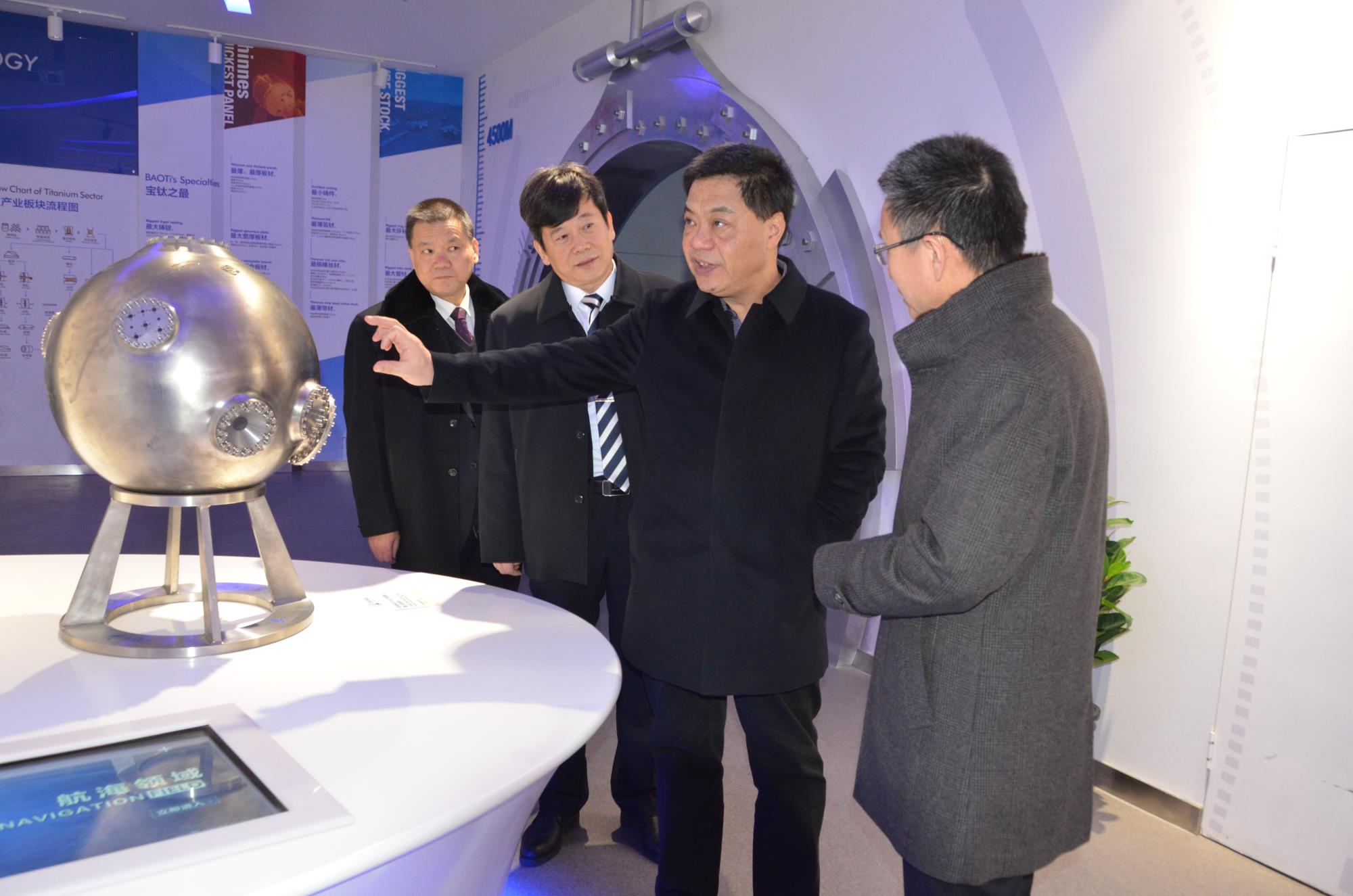 陜西有色金屬集團(tuán)黨委書(shū)記、董事長(zhǎng)馬寶平(左三)到寶鈦集團(tuán)指導(dǎo)科技創(chuàng)新工作。