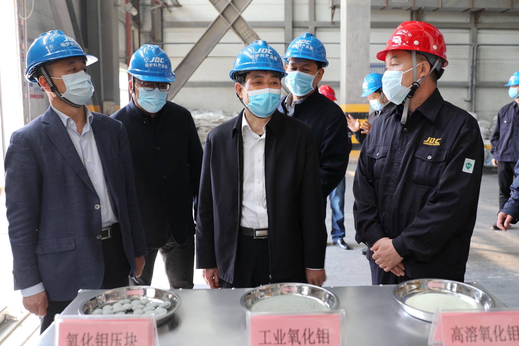 陜西有色金屬集團(tuán)黨委副書(shū)記、總經(jīng)理鄒武裝(左三)到金鉬集團(tuán)指導(dǎo)復(fù)工復(fù)產(chǎn)工作。