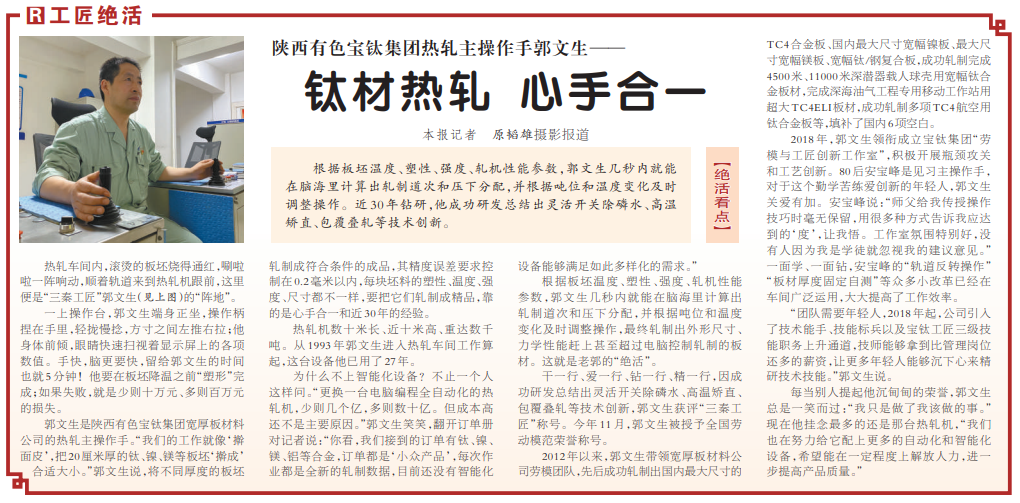郭文生是陜西有色寶鈦集團(tuán)寬厚板材料公司的熱軋主操作手。“我們的工作就像‘搟面皮’,把20厘米厚的鈦、鎳、鎂等板坯‘搟成’合適大小。”郭文生說,將不同厚度的板坯軋制成符合條件的成品,其精度誤差要求控制在0.2毫米以內(nèi),每塊坯料的塑性、溫度、強(qiáng)度、尺寸都不一樣,要把它們軋制成精品,靠的是心手合一和近30年的經(jīng)驗。