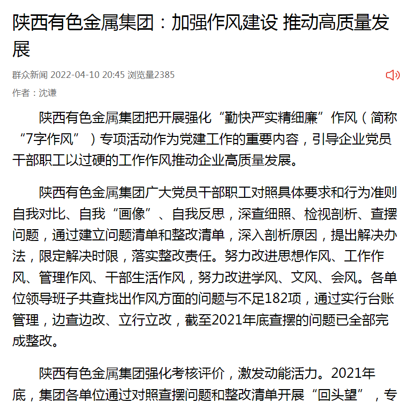 陜西有色金屬集團把開展強化“勤快嚴實精細廉”作風(fēng)(簡稱“7字作風(fēng)”)專項活動作為黨建工作的重要內(nèi)容,引導(dǎo)企業(yè)黨員干部職工以過硬的工作作風(fēng)推動企業(yè)高質(zhì)量發(fā)展。