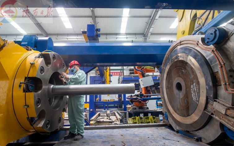5月6日,在寶鈦集團(tuán)高品質(zhì)鈦錠、管材及型材生產(chǎn)線建設(shè)項(xiàng)目現(xiàn)場(chǎng),技術(shù)人員使用百分表安裝調(diào)試設(shè)備。