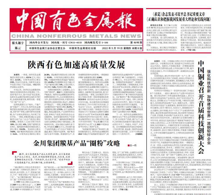 科技創(chuàng)新持續(xù)釋放新動能,高質(zhì)量發(fā)展增添新活力。陜西有色金屬集團堅持實施創(chuàng)新驅(qū)動發(fā)展戰(zhàn)略,以秦創(chuàng)原陜西有色金屬集團聯(lián)合創(chuàng)新中心建設(shè)1周年為契機,加大力度探索創(chuàng)新路徑、創(chuàng)新模式和創(chuàng)新機制,著力打造創(chuàng)新高地。一季度,寶鈦集團代表中國主導(dǎo)制訂的第一項鈦領(lǐng)域國際標準ISO23515《鈦及鈦合金命名系統(tǒng)》正式發(fā)布實施,標志著我國在鈦領(lǐng)域國際標準化工作中實現(xiàn)歷史性突破,引發(fā)業(yè)內(nèi)廣泛關(guān)注。金鉬集團與西安交通大學(xué)聯(lián)合完成的“高端顯示及光伏用高純大尺寸鉬及鉬合金靶材關(guān)鍵制備技術(shù)與應(yīng)用”等4項成果獲得2021年度陜西省科學(xué)技術(shù)進步獎二等獎。黃金集團西安匯創(chuàng)公司聯(lián)合西安交通大學(xué)共同申報的“貴金屬3D打印及催化研究與應(yīng)用”入選2022年度秦創(chuàng)原“科學(xué)家+工程師”名單。