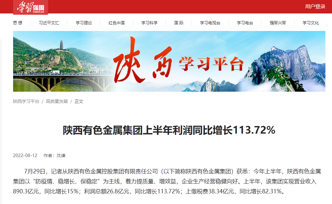 7月29日,記者從陜西有色金屬控股集團有限責任公司(以下簡稱陜西有色金屬集團)獲悉:今年上半年,陜西有色金屬集團以“防疫情、穩(wěn)增長、保穩(wěn)定”為主線,著力提質(zhì)量、增效益,企業(yè)生產(chǎn)經(jīng)營穩(wěn)健向好。上半年,該集團實現(xiàn)營業(yè)收入890.3億元,同比增長15%;利潤總額26.8億元,同比增長113.72%;上繳稅費38.34億元,同比增長82.31%。