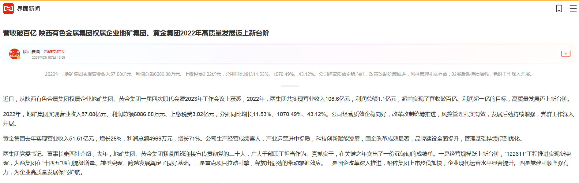 界面新聞:營收破百億 陜西有色金屬集團(tuán)權(quán)屬企業(yè)地礦集團(tuán)、黃金集團(tuán)2022年高質(zhì)量發(fā)展邁上新臺階