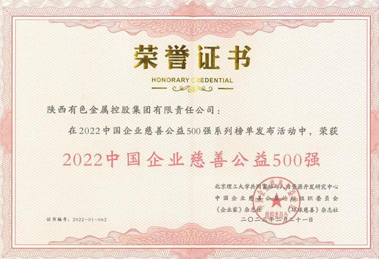 近日,2022中國企業(yè)慈善公益500強發(fā)布暨第六屆中國企業(yè)慈善公益論壇在重慶涪陵舉行,陜西有色金屬集團榮獲“2022中國企業(yè)慈善公益500強”榮譽稱號。