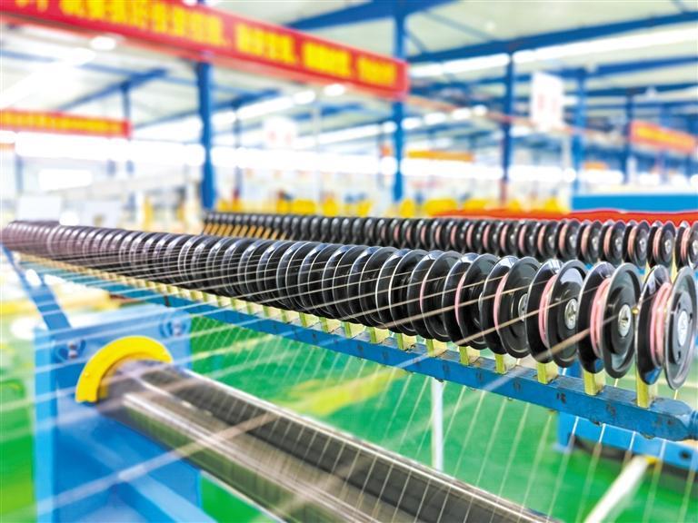 4月6日,在正威寶雞銅基新材料產(chǎn)業(yè)基地項(xiàng)目年產(chǎn)10萬噸精密銅線生產(chǎn)車間內(nèi),銅桿原材料經(jīng)過精密儀器加工后,變成了精密銅線。 本報(bào)記者 李宛嶸攝