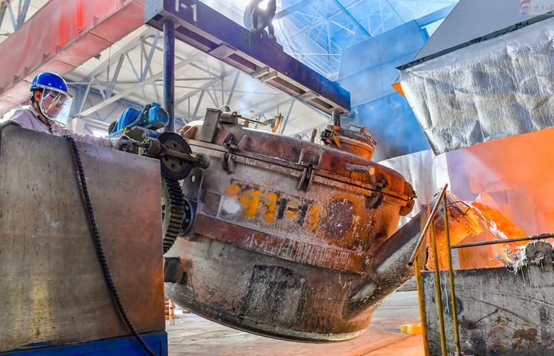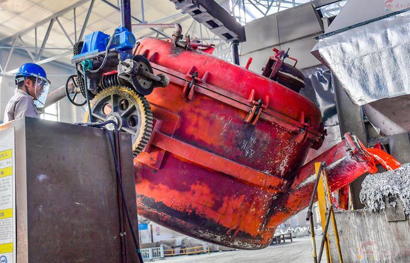 6月12日,在陜西有色榆林新材料集團鑄造車間,工人正進行入鋁作業(yè)。