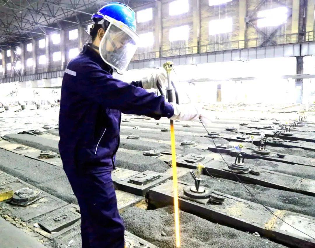 不管是早班還是晚班,我們這些熟練工基本都是滿負(fù)荷作業(yè),更不用說(shuō)新人。”王彥龍說(shuō)。跟隨王彥龍走進(jìn)車(chē)間,此時(shí)電解槽旁的溫度更是高達(dá)60℃以上。在一頓繁雜的操作后,王彥龍指揮天車(chē)將殘極提了起來(lái),撈塊、扒沉淀……整個(gè)作業(yè)持續(xù)了30分鐘左右。