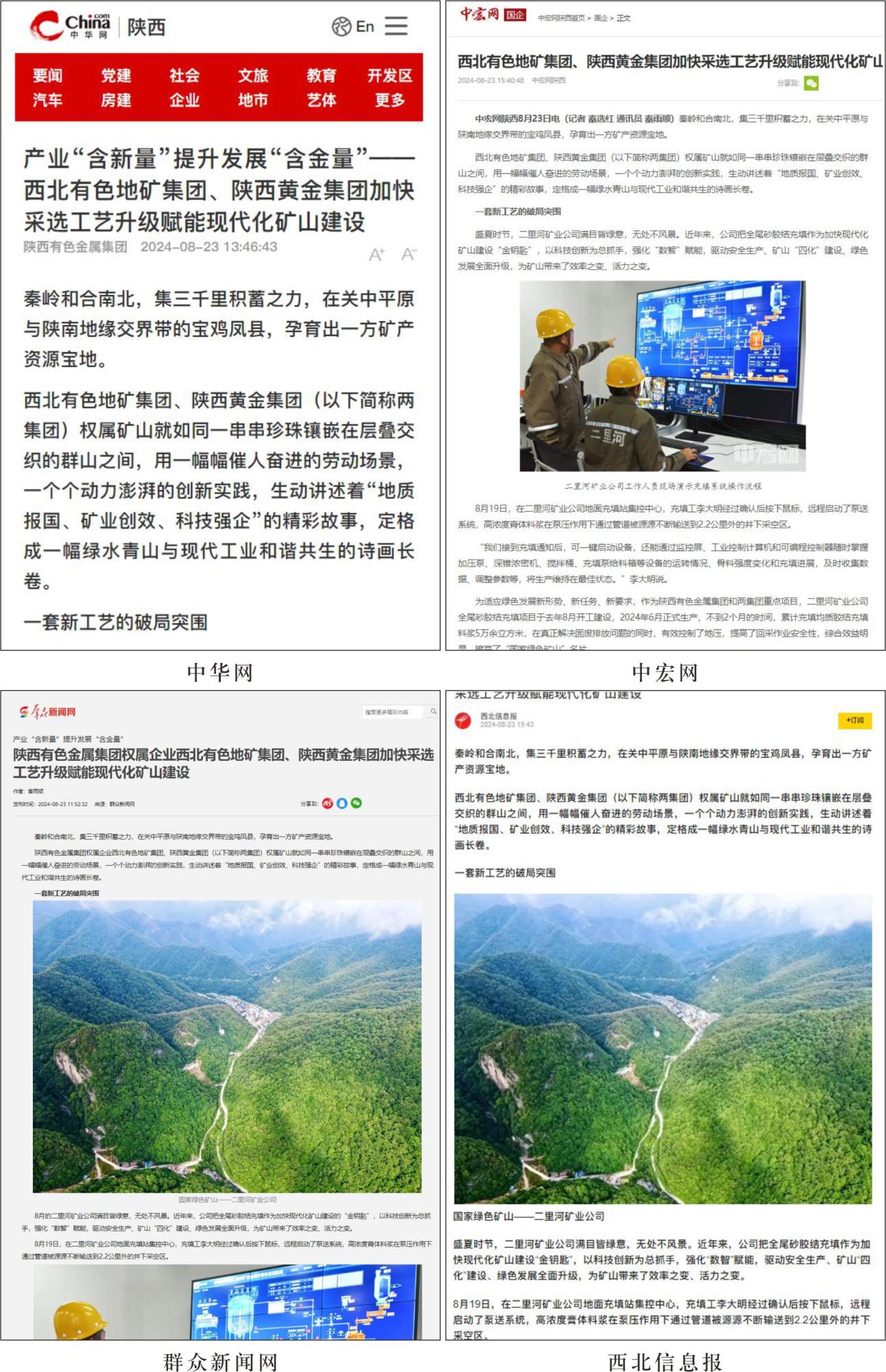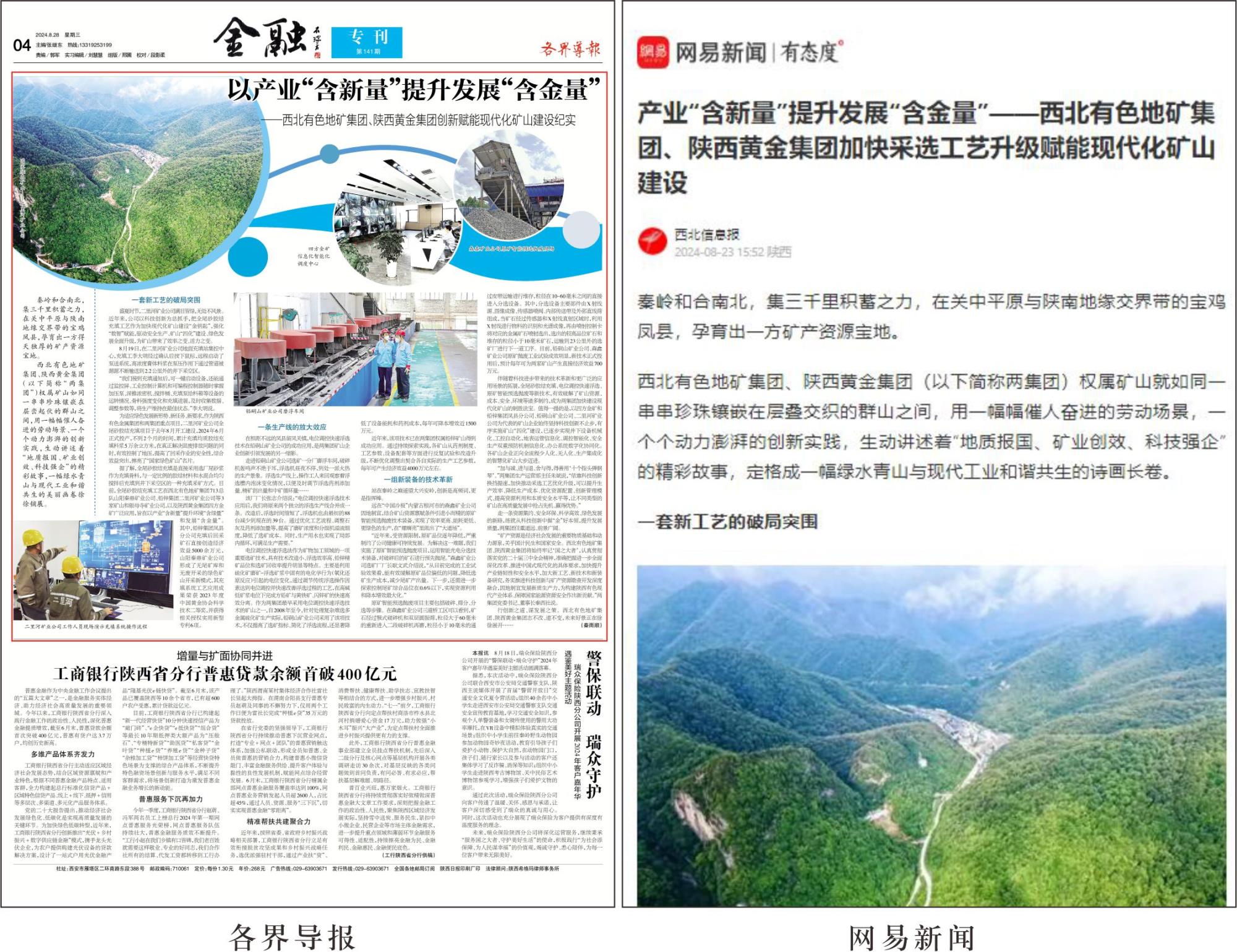 近日,人民數(shù)字聯(lián)播網(wǎng)、環(huán)球時報、中華網(wǎng)、中宏網(wǎng)、陜西日報、群眾新聞網(wǎng)、中國有色金屬報、西北信息報、各界導報等十余家中、省主流媒體,分別以《產(chǎn)業(yè)“含新量”提升發(fā)展“含金量”——西北有色地礦集團、陜西黃金集團加快采選工藝升級賦能現(xiàn)代化礦山建設》《陜西礦山企業(yè)積極推進綠色礦山建設,實現(xiàn)生態(tài)、經(jīng)濟和社會效益有機統(tǒng)一——采礦不“見”礦 礦在綠中藏》為題,紛紛聚焦兩集團在統(tǒng)籌推進科技創(chuàng)新、產(chǎn)業(yè)創(chuàng)新,因地制宜加快采選工藝升級,賦能現(xiàn)代化礦山建設方面的新進展、新成效。