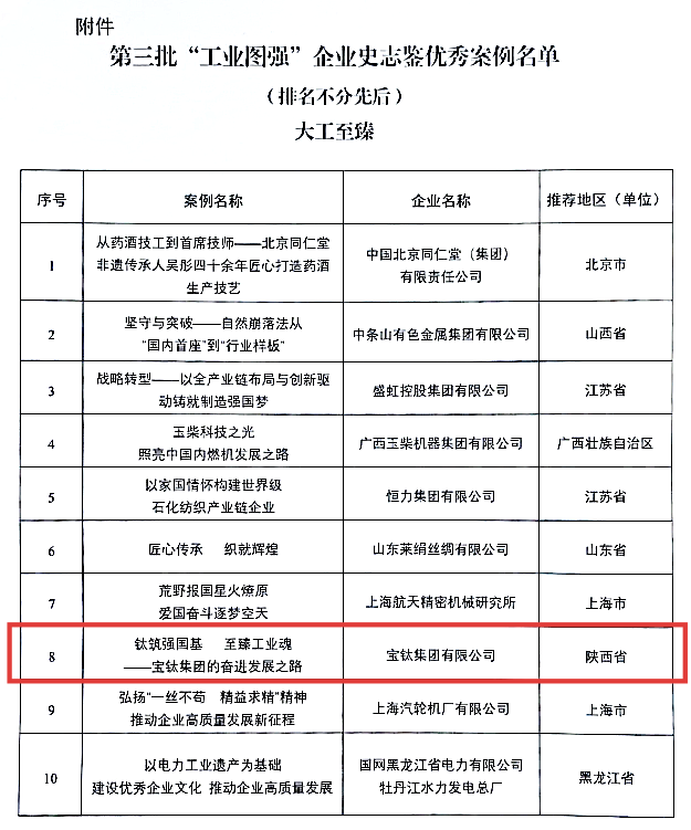 西北在線、西北信息報(bào)、網(wǎng)易新聞、今日頭條、騰訊內(nèi)容開放平臺:寶鈦集團(tuán)入選工信部工業(yè)文化發(fā)展中心第三批 “工業(yè)圖強(qiáng)”企業(yè)史志鑒優(yōu)秀案例名單