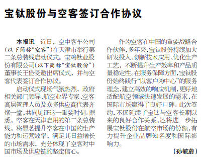 近日,空中客車公司(以下簡稱“空客”)在天津市舉行第二條總裝線啟動(dòng)儀式。寶雞鈦業(yè)股份有限公司(以下簡稱“寶鈦股份”)董事長王儉受邀出席儀式,并與空客代表簽訂合作協(xié)議。