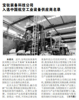 寶鈦裝備科技公司將以此為契機(jī),緊跟航空數(shù)智化發(fā)展浪潮,持續(xù)強(qiáng)化技術(shù)與服務(wù)優(yōu)勢,積極與產(chǎn)業(yè)鏈上下游協(xié)同創(chuàng)新,為我國航空工業(yè)的科技進(jìn)步與產(chǎn)業(yè)升級(jí)貢獻(xiàn)智慧與力量,向著國際一流高端裝備制造與服務(wù)提供商的目標(biāo)穩(wěn)步邁進(jìn)。