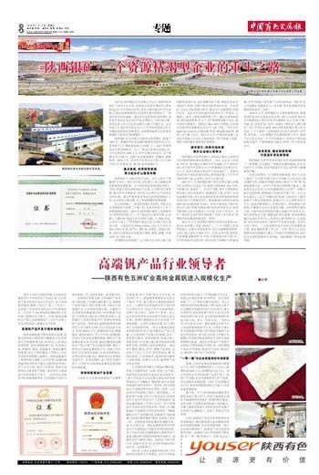 中國有色金屬報:高端釩產(chǎn)品行業(yè)領(lǐng)導(dǎo)者——陜西有色五洲礦業(yè)高純金屬釩進(jìn)入規(guī)模化生產(chǎn)