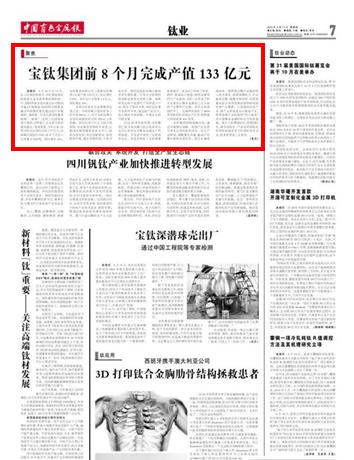 寶雞市鈦及鈦合金規(guī)模居全國之首,市場份額占國內(nèi)鈦加工材市場80%以上,其中寶鈦品牌占有國內(nèi)高端鈦材市場95%以上的份額。面對經(jīng)濟下行壓力加大的局面,寶鈦集團堅持穩(wěn)中求進,以提高發(fā)展質(zhì)量和效益為中心,狠抓改革攻堅,突出創(chuàng)新驅(qū)動,加快轉(zhuǎn)型升級,強化風(fēng)險防控,大膽開拓市場。特別是搶抓絲綢之路經(jīng)濟帶發(fā)展機遇,引導(dǎo)企業(yè)依靠科技創(chuàng)新走差異化發(fā)展之路,使新研發(fā)出的產(chǎn)品替代了同類進口產(chǎn)品,穩(wěn)住了國內(nèi)市場,同時還注重開發(fā)國外市場,通過新產(chǎn)品出口,搶占國際市場份額,實現(xiàn)企業(yè)的平穩(wěn)發(fā)展。
