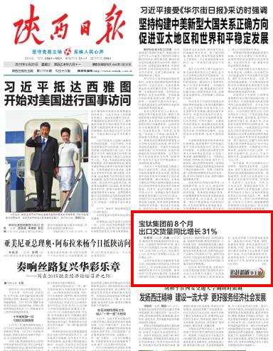 陜西日?qǐng)?bào)、陜西工人報(bào):寶鈦集團(tuán)前8個(gè)月出口交貨量同比增長(zhǎng)31%