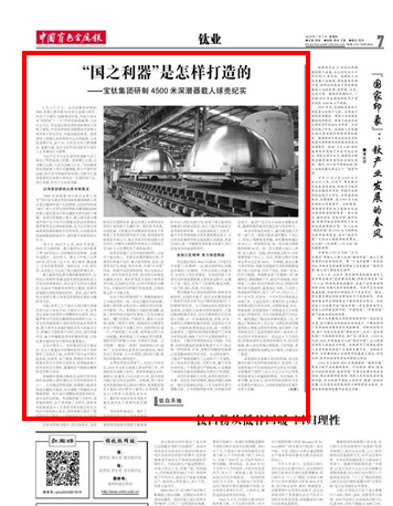 習近平總書記在全國科技創(chuàng)新大會上指出:“科技是國之利器,國家賴之以強,企業(yè)賴之以贏,人民生活賴之以好。”寶鈦集團承擔國家重大項目關鍵課題,努力開展科技創(chuàng)新、技術攻關和新材料研制,為傾力打造深潛器鈦合金載人球殼這一尖端科技產(chǎn)品、國之利器,作出了應有的貢獻。