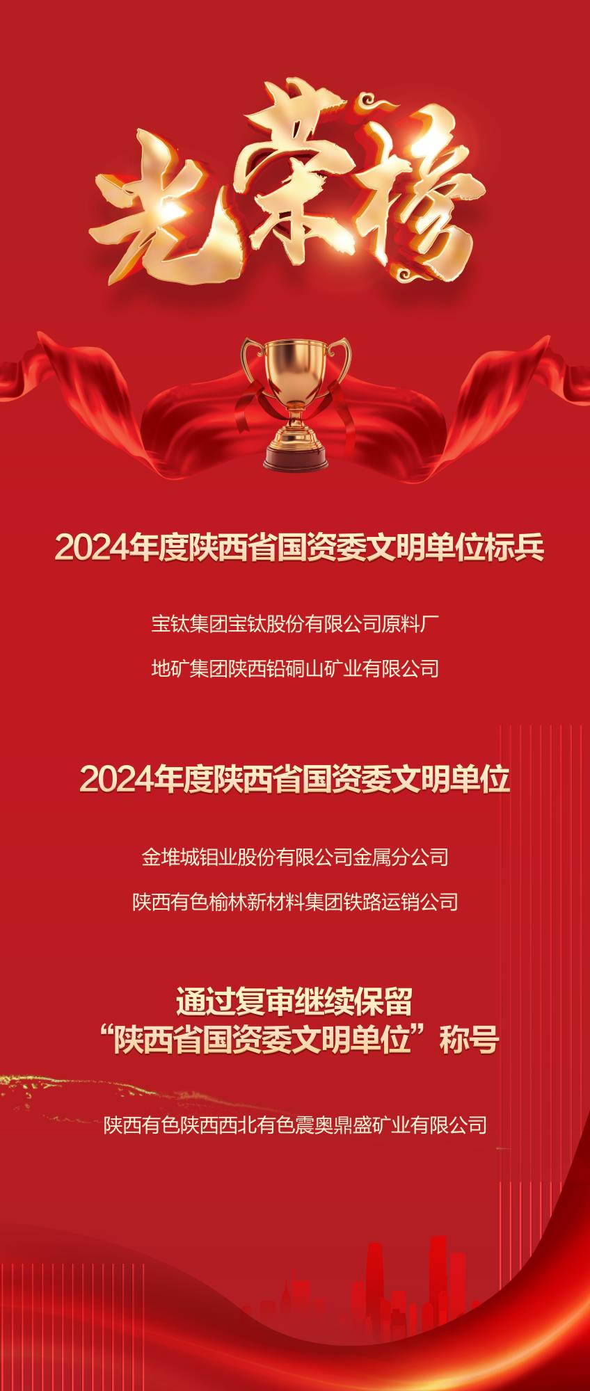 近日,陜西省國(guó)資委黨委命名表彰了2024年度陜西省國(guó)有企業(yè)文明單位(標(biāo)兵),陜西有色金屬集團(tuán)推薦申報(bào)的5家單位全部榜上有名。