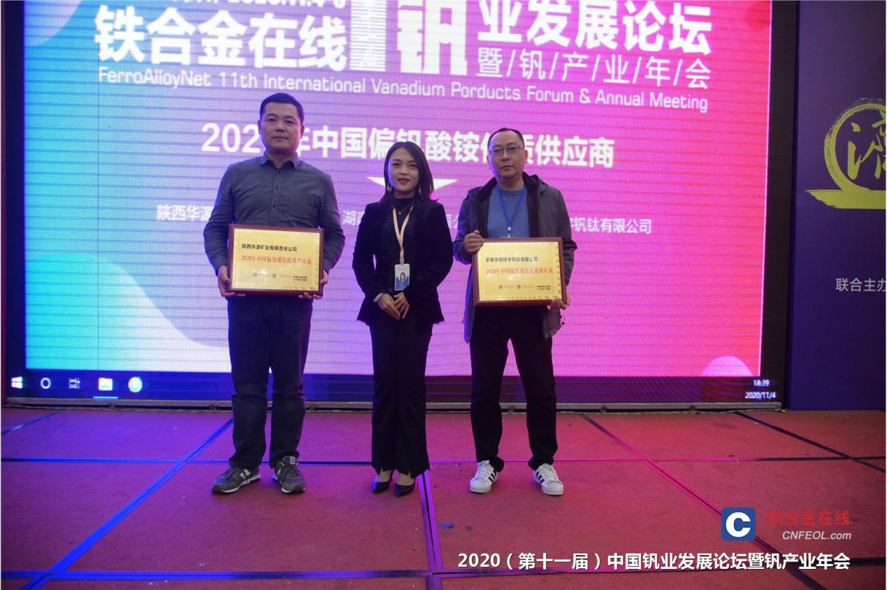 在當晚舉辦的“2020年中國釩行業年度優質供應商”頒獎典禮上,陜西華源礦業有限責任公司以其優質的產品和良好的信譽,獲得了業內上下游客戶的一致好評,被評定為“2020年中國偏釩酸銨優質供應商”。公司將以此為契機,繼續堅持“綠色環保、規模開發、高效利用釩資源”的發展理念,為行業發展貢獻力量。
