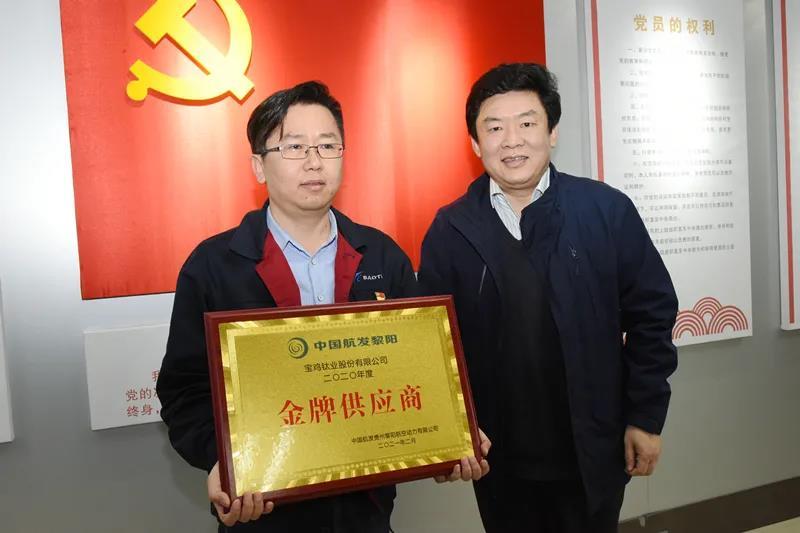 3月10日,在寶鈦股份與中國航發黎陽動力黨建共建活動啟動儀式上,中國航發黎陽動力黨委副書記、工會主席呂蓬向寶鈦股份頒發了2020年度“金牌供應商”榮譽獎牌。作為其鈦材供應戰略合作供應商,寶鈦股份已連續三年獲此殊榮。