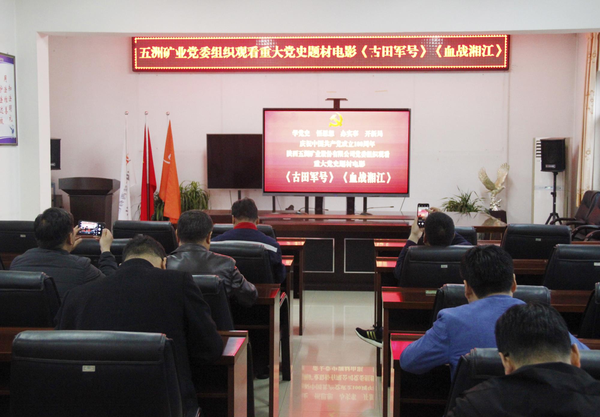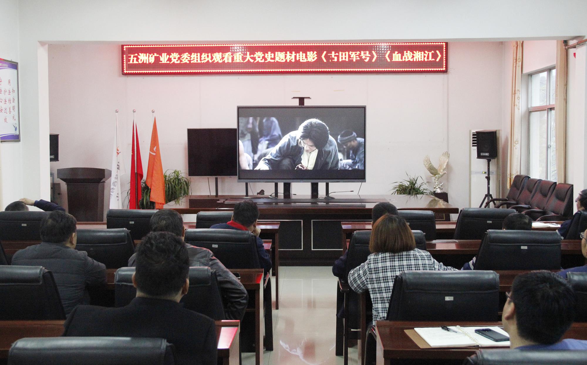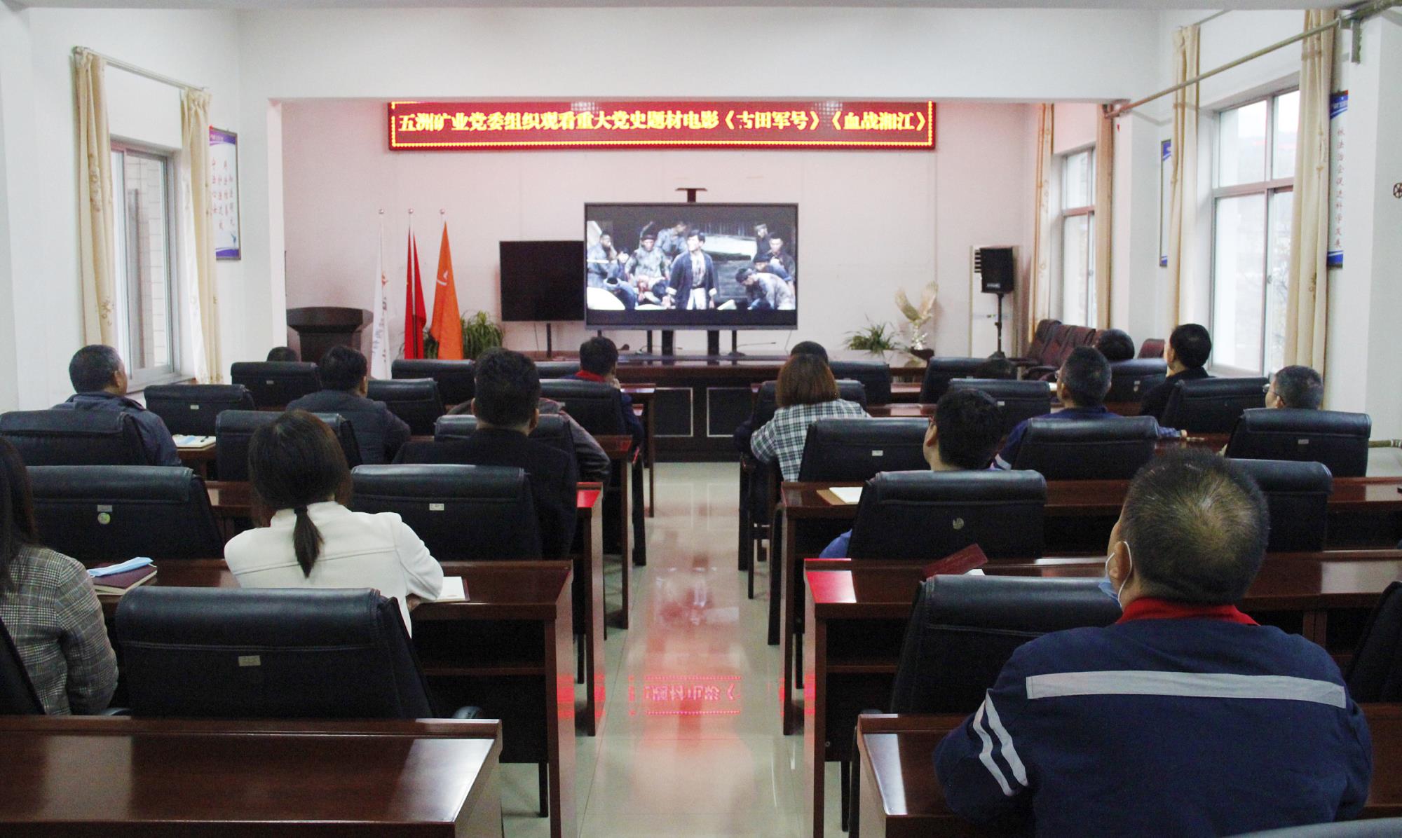 為慶祝中國共產黨成立100周年,扎實推進黨史學習教育,4月1日,五洲礦業黨委組織中層以上黨員干部在四樓會議室觀看重大黨史題材電影《古田軍號》《血戰湘江》。