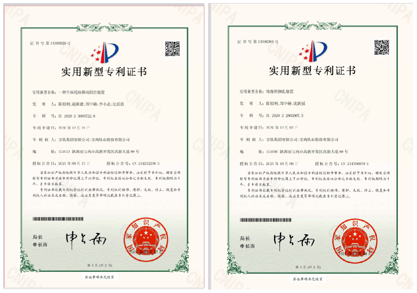 近日,寶鈦集團原料廠自主研發的《殘廢料捆扎裝置》和《一種車床尾座移動限位裝置》研究改造成果成功獲得國家實用新型專利的授權,并取得專利證書。