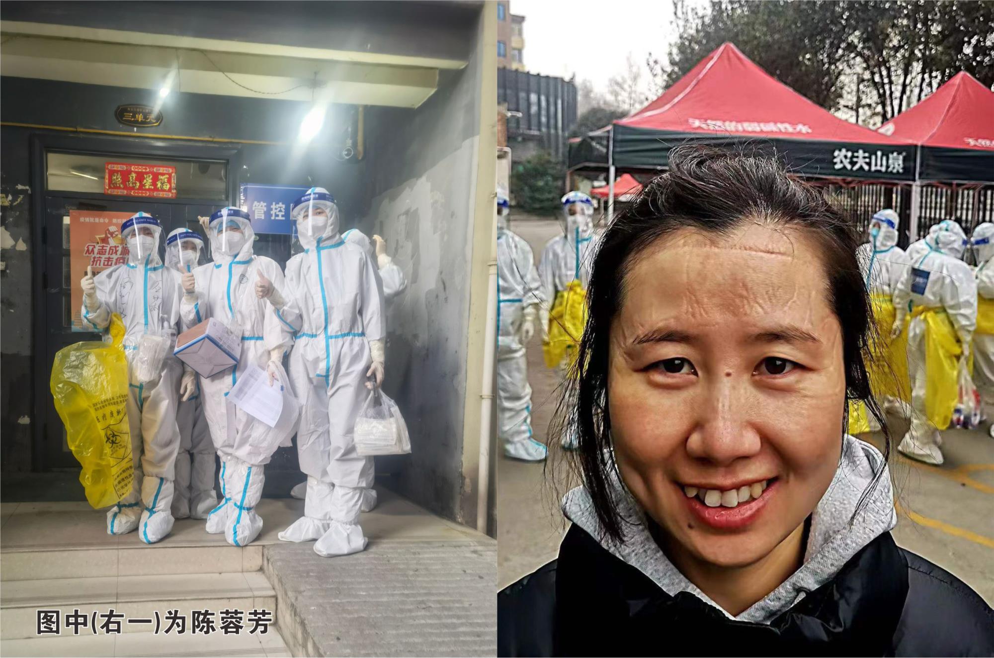 參與社區防疫工作,難免要跟病毒“面對面”、“掰手腕”。廣交社區日報社小區有1名確診病例,是重點封控小區。兩集團規劃發展部下沉干部陳蓉芳主動請戰,負責確診樓的核酸掃碼工作。她坦言,第一次近距離和密接人員接觸,難免需要一些勇氣,但能和其他醫護人員一起去戰斗,又感到非常驕傲。在層層防護服的包裹下,每次持續工作5到6個小時、爬16層樓,頭痛、目眩、潮熱、呼吸困難是常有的事。摘掉面罩和口罩,滿臉的壓痕擋不住美麗的微笑。“怕么?”她用實際行動給出了答案。