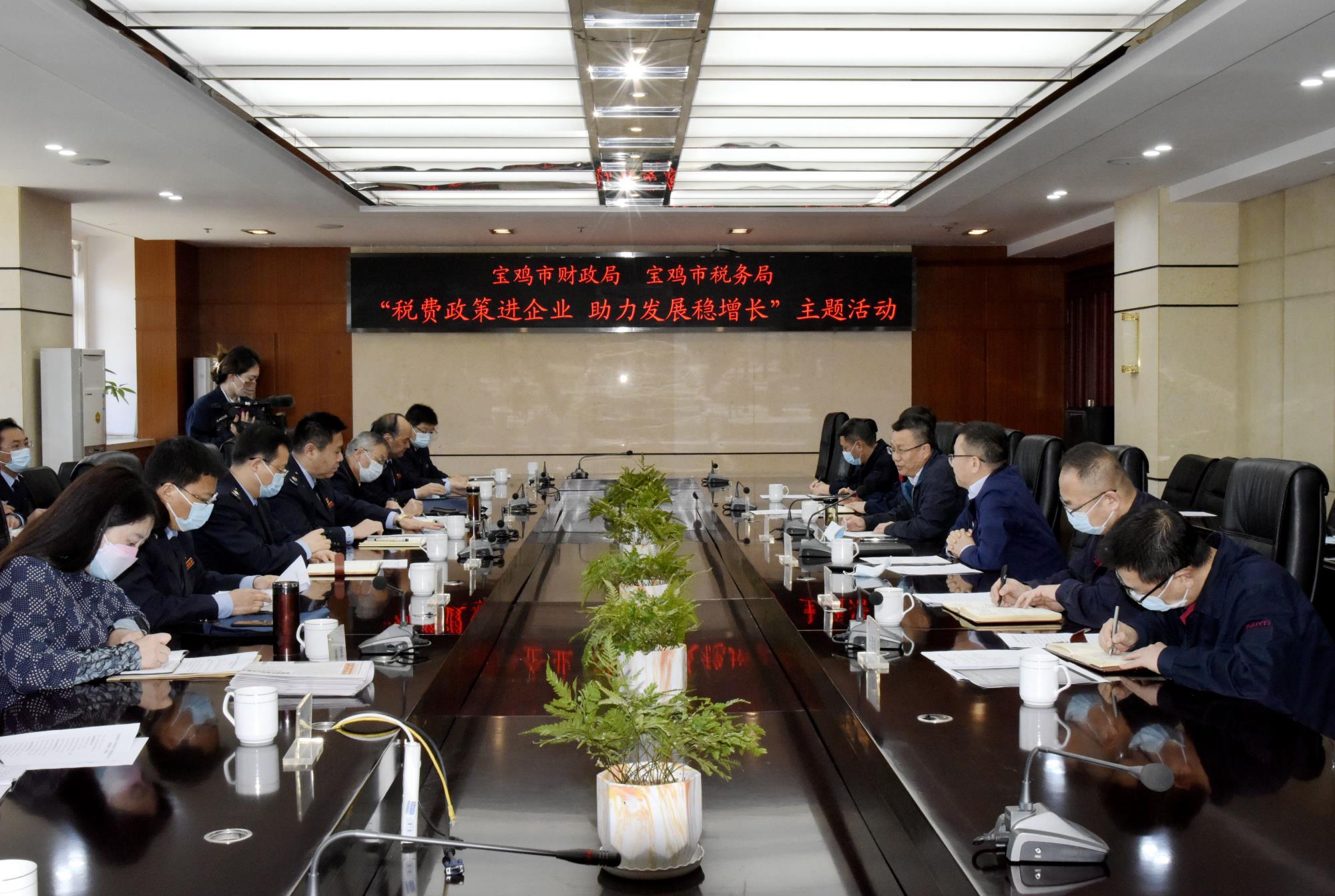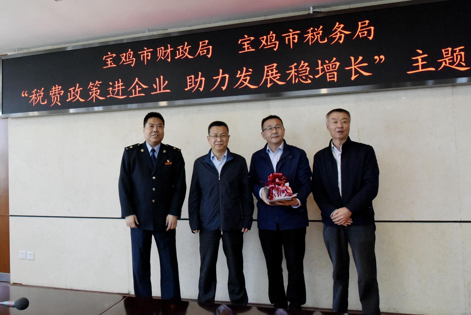 4月25日,寶雞市市稅務局黨委書記、局長程濤,市財政局黨組成員、副局長張曄平一行來到寶鈦集團,開展“稅費政策進企業 助力發展穩增長”主題活動。寶鈦集團黨委副書記、總經理雷讓岐,總會計師余和明及相關部門負責人參加活動。
