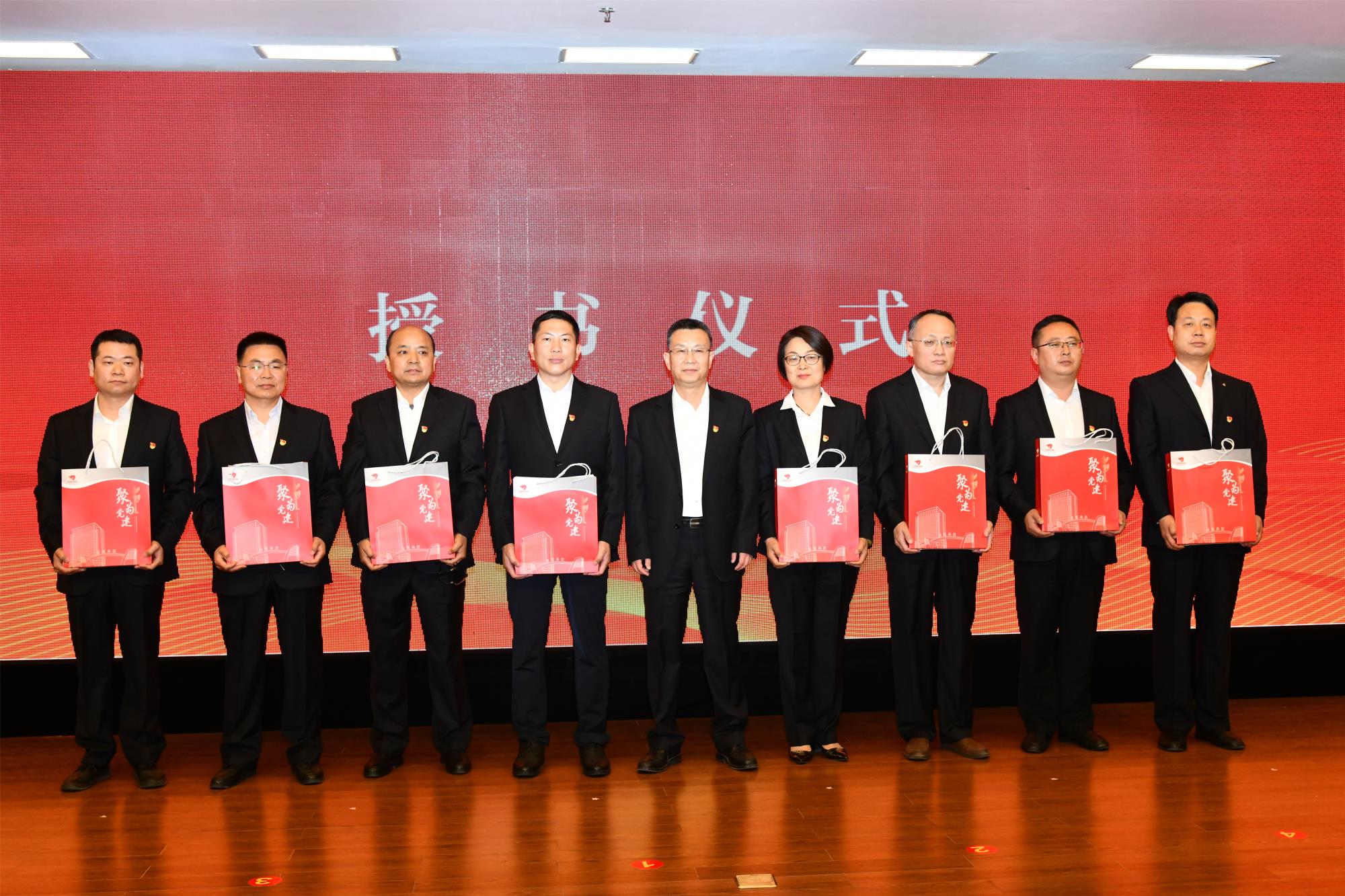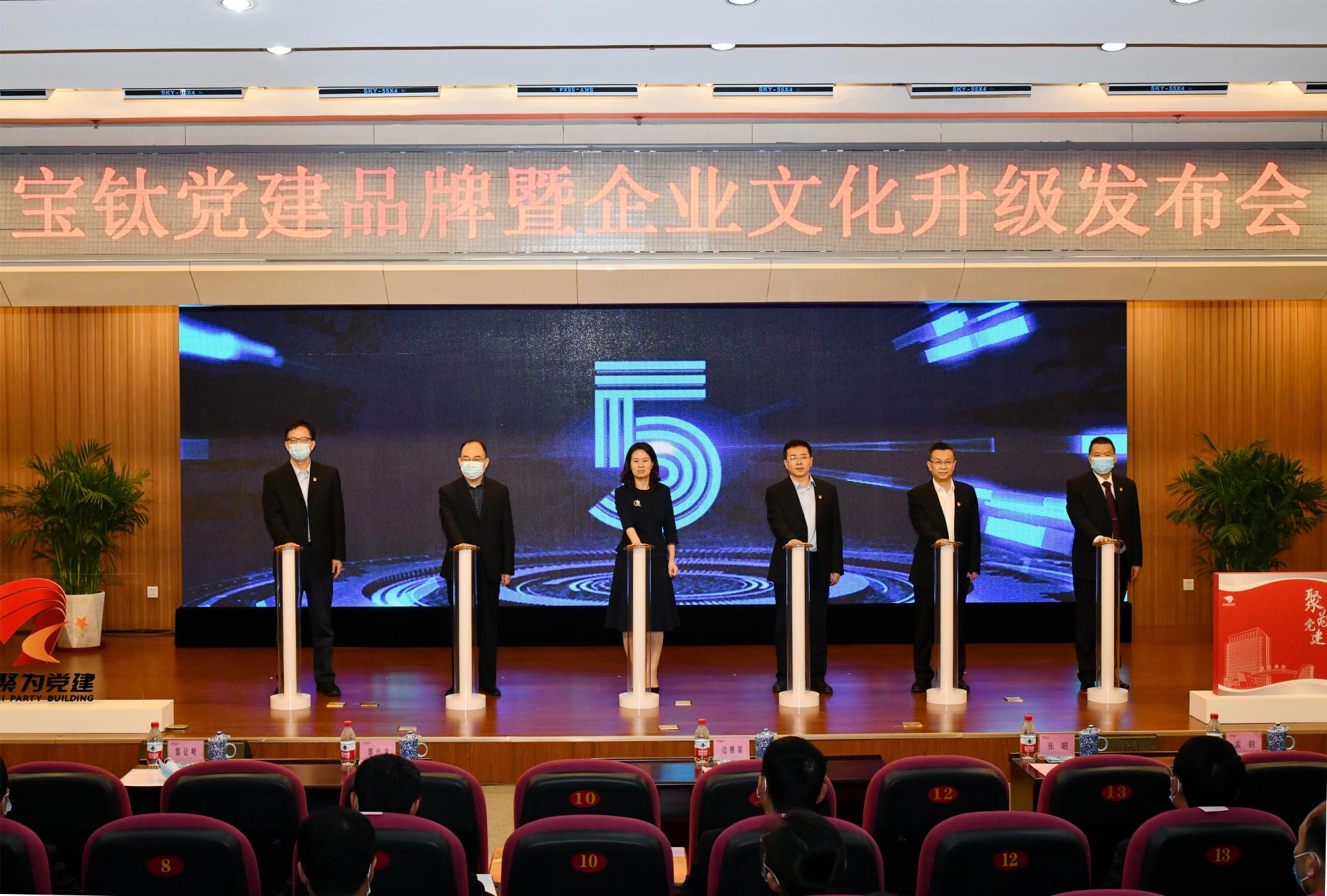 在磅礴大氣的音樂聲中,出席發布會的領導共同啟動寶鈦黨建品牌暨企業文化升級發布儀式。伴隨著會場激動人心的倒計數聲音“5-4-3-2-1-啟動”,臺上領導右手輕觸發布柱上的金手印,六座發布柱瞬間點亮,寶鈦聚為黨建品牌、聚為文化正式發布!