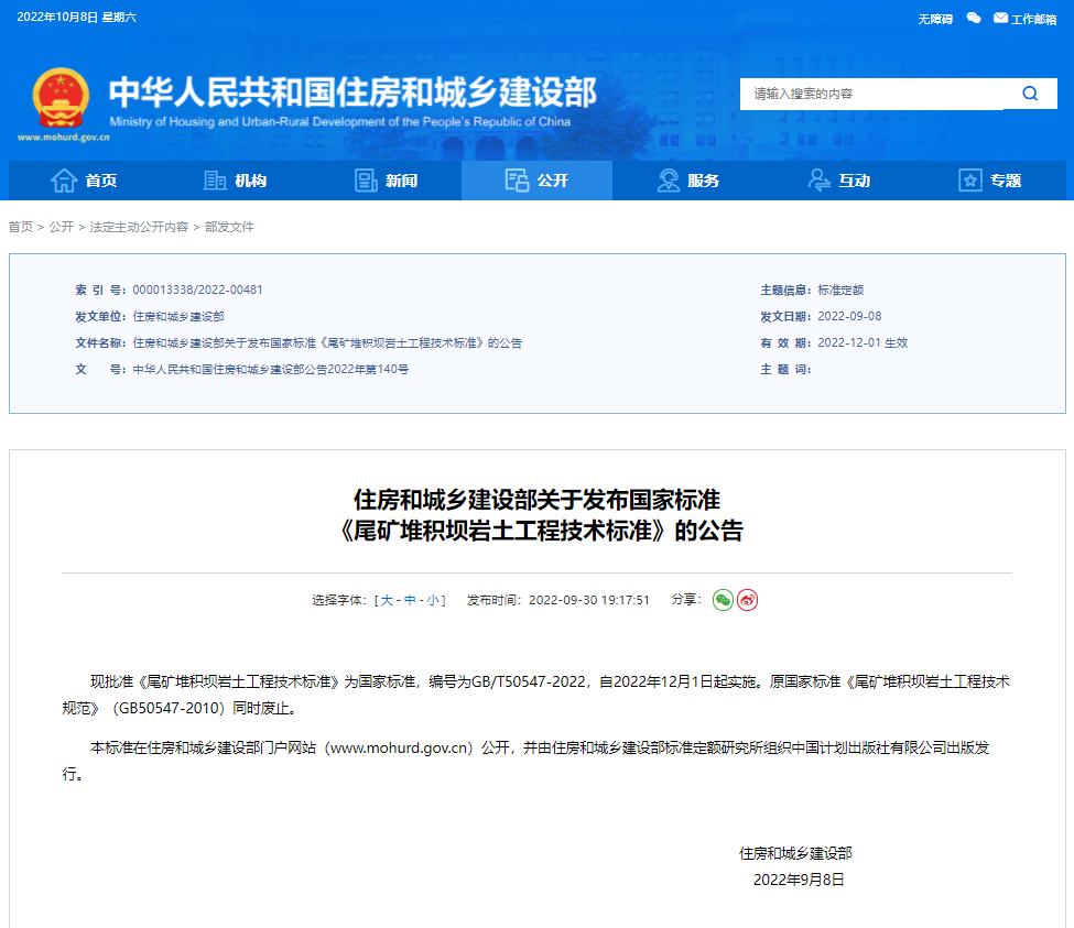 近日,住房和城鄉建設部發布2022年第140號公告,西安勘察設計院主編的國家標準《尾礦堆積壩巖土工程技術標準》GB/T 50547-2022獲批發布,將于2022年12月1日起實施。