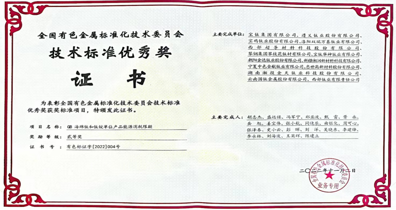 近日,2022年度全國有色金屬標準化技術委員會年會發布了全國有色金屬領域技術標準獲獎名單。由寶鈦集團主持制定的強制性國家標準《海綿鈦和鈦錠單位產品能源消耗限額》榮獲“全國有色金屬標準化技術委員會技術標準優秀獎”。