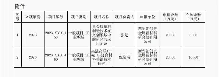 近日,陜西省科技廳下發《陜西省2023年科技計劃項目補助經費的通知》,公布了2023年陜西省重點研發計劃項目,匯創公司申報的《貴金屬增材制造技術在文創領域中的研究與應用示范》和《高強高導Au-Ag-Cu復合材料關鍵技術研究》項目位列其中。