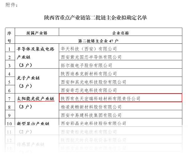 2023年6月6日,陜西省工業和信息化廳對陜西省重點產業鏈第二批鏈主企業擬確定名單進行了公示,陜西有色天宏瑞科硅材料有限責任公司成功入選太陽能光伏產業鏈鏈主企業。
