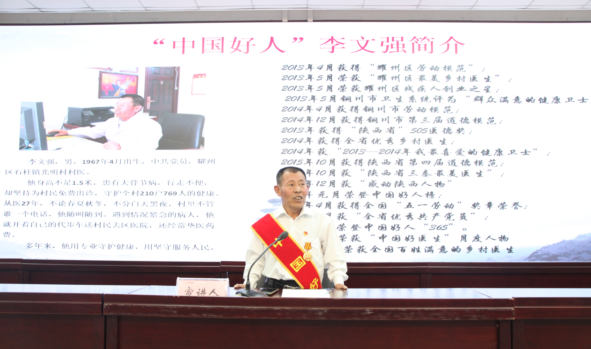 擁有“中國好人”“全國五一勞動獎章”“中國好醫生”等諸多榮譽的耀州區石柱鎮光明村村醫李文強受邀來的活動現場。他分享了自己在患有大骨節病,行走不便的情況下,扎根鄉村27年,堅持為村民免費出診,守護全村210戶769人健康的感人事跡。現場人員被他質樸的語言、真摯的情感以及無私奉獻的崇高精神深深打動,獻上了久久不息的掌聲。