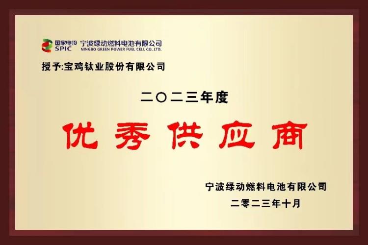 近日,寶鈦股份在國家電投寧波綠動燃料電池有限公司供應商評比中,榮獲“優秀供應商”稱號。
