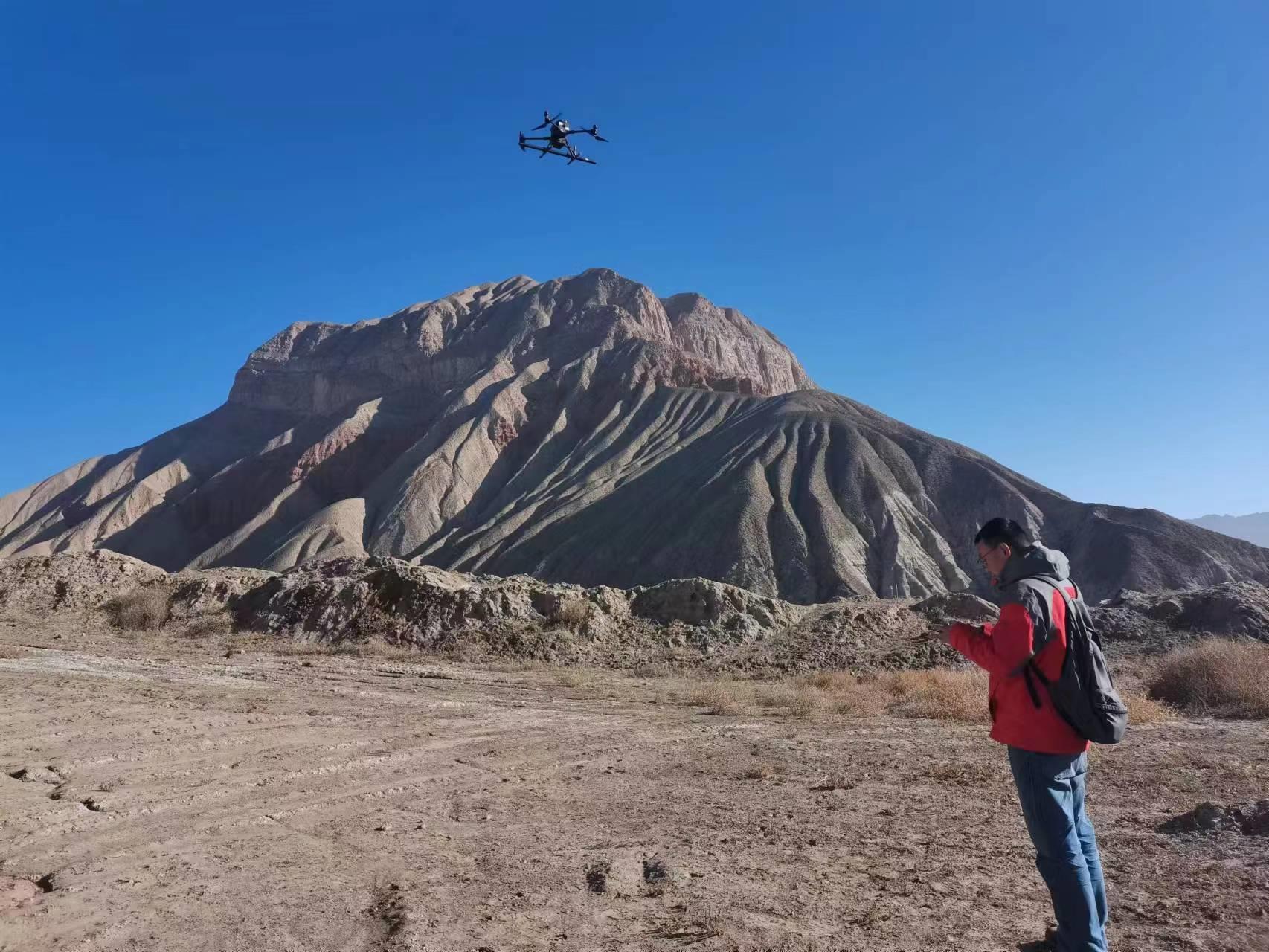 ▲新疆喀什煤田火燒區(qū)探測(cè)項(xiàng)目飛手正在進(jìn)行低空航磁數(shù)據(jù)采集