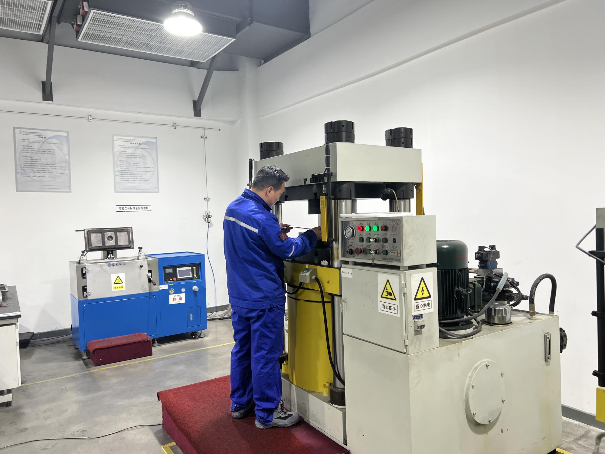 生產(chǎn)人員在四柱油壓機(jī)前進(jìn)行黃金制坯工藝
