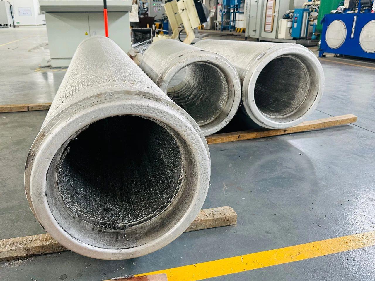 近日,榆林新材料集團(tuán)研發(fā)中心與某鋁合金企業(yè)聯(lián)合研發(fā)的鋁錫合金空心管狀鑄件,在中試生產(chǎn)線熔鑄產(chǎn)線試制成功,所制鋁管外徑485毫米,內(nèi)徑365毫米,總長度2780毫米,實現(xiàn)了60毫米薄壁管件連續(xù)鑄造,而目前使用深井鑄造工藝生產(chǎn)此類管狀鑄件,設(shè)計壁厚普遍為80到100毫米。本次試驗成果將能極大降低了后序精、深加工難度,減少加工余量,提高材料利用率和生產(chǎn)效率,推動落實“降本增效”目標(biāo)。