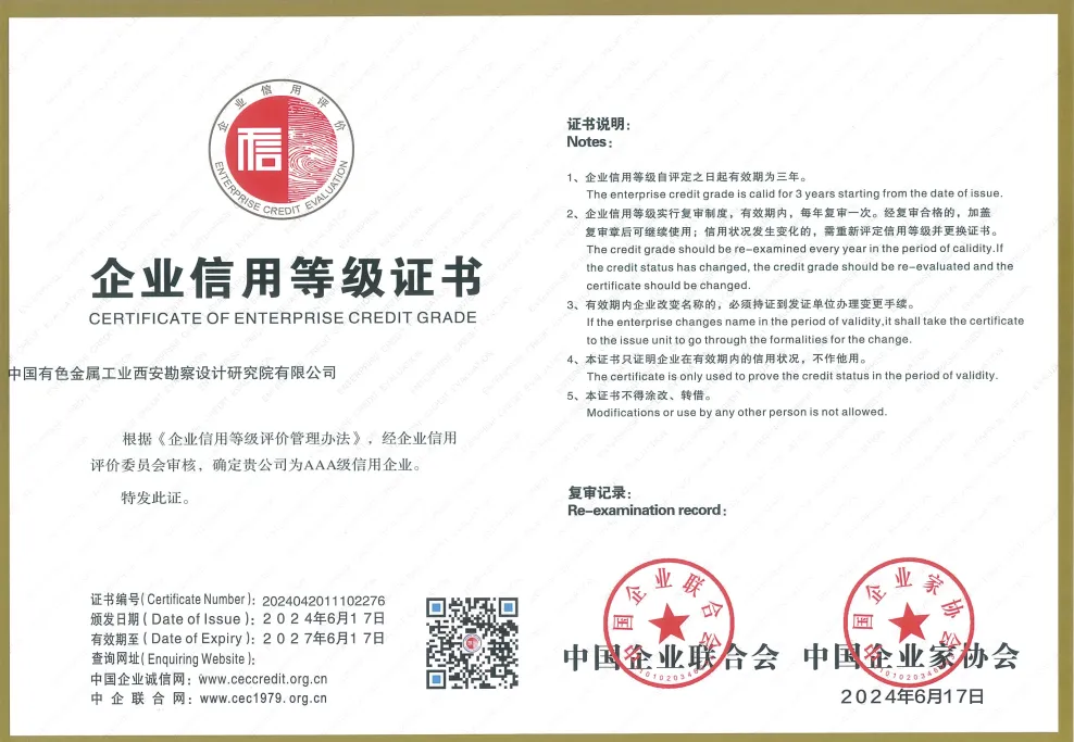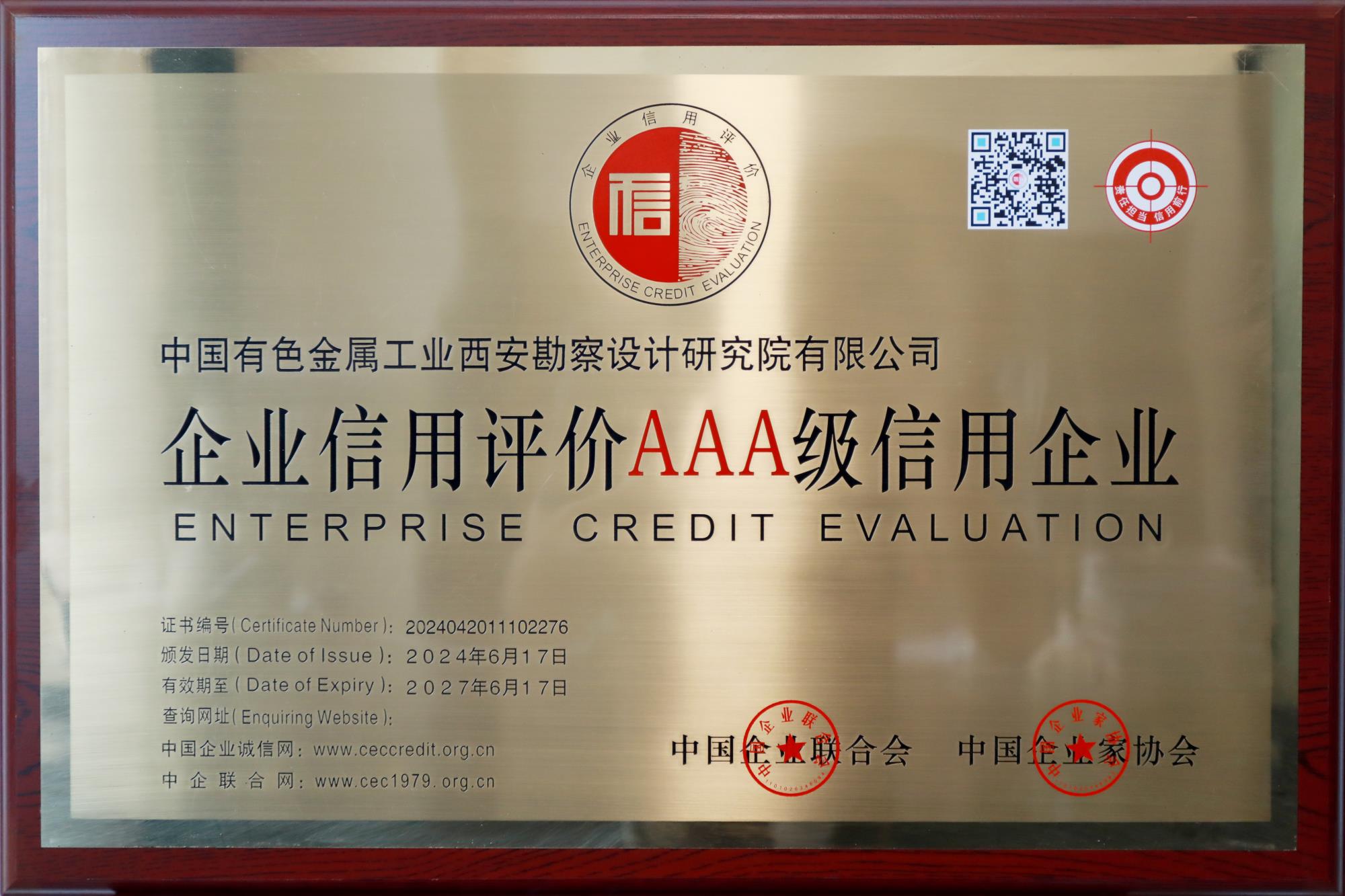 近日,西安勘察設(shè)計(jì)院榮獲由中國(guó)企業(yè)聯(lián)合會(huì)和中國(guó)企業(yè)家協(xié)會(huì)頒發(fā)的2024年企業(yè)信用評(píng)價(jià)AAA級(jí)信用企業(yè)稱號(hào),為國(guó)家企業(yè)信用評(píng)價(jià)最高等級(jí)。