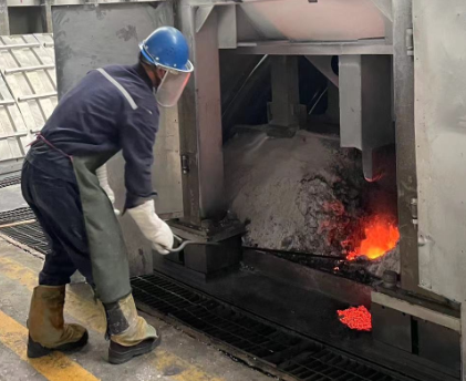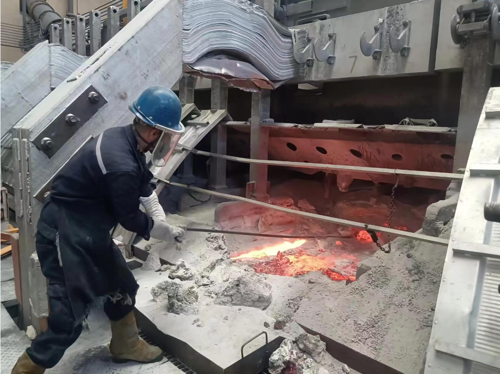 持續(xù)的高溫天氣讓電解車間里溫度“爆表”,加上電解槽散發(fā)出來的陣陣熱浪,讓整個(gè)廠房像是一座蒸爐,電解槽周邊溫度高達(dá)50℃以上,在換極區(qū)域,溫度更是突破了70℃以上。期間,電解工包裹著厚厚的工作服,頭戴有防護(hù)面罩的安全帽,細(xì)致地在進(jìn)行著換陽極、扒料、扎邊、撈塊等作業(yè)。