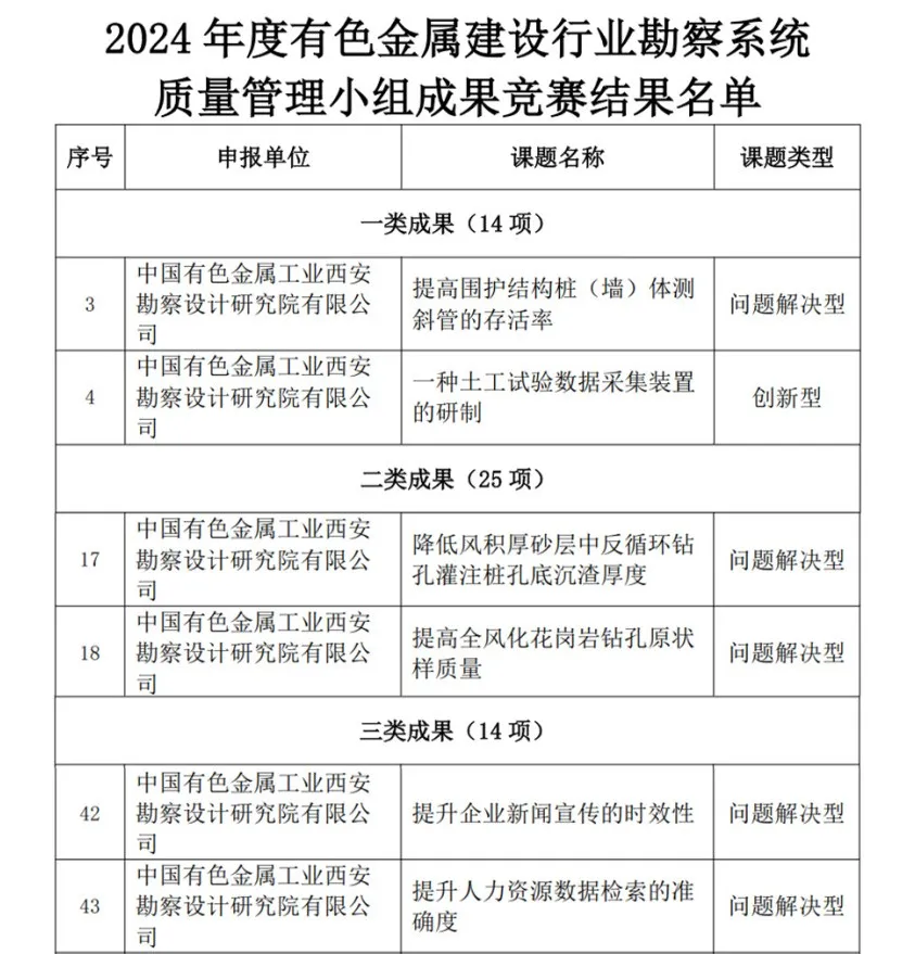 近日,中國有色金屬建設(shè)協(xié)會公布了2024年度有色建設(shè)行業(yè)勘察系統(tǒng)質(zhì)量管理小組成果競賽活動(部級)獲獎項(xiàng)目名單,西安勘察設(shè)計院組織申報的《提高圍護(hù)結(jié)構(gòu)樁(墻)體測斜管的存活率》《一種土工試驗(yàn)數(shù)據(jù)采集裝置的研制》等6項(xiàng)成果,分獲一、二、三獎。