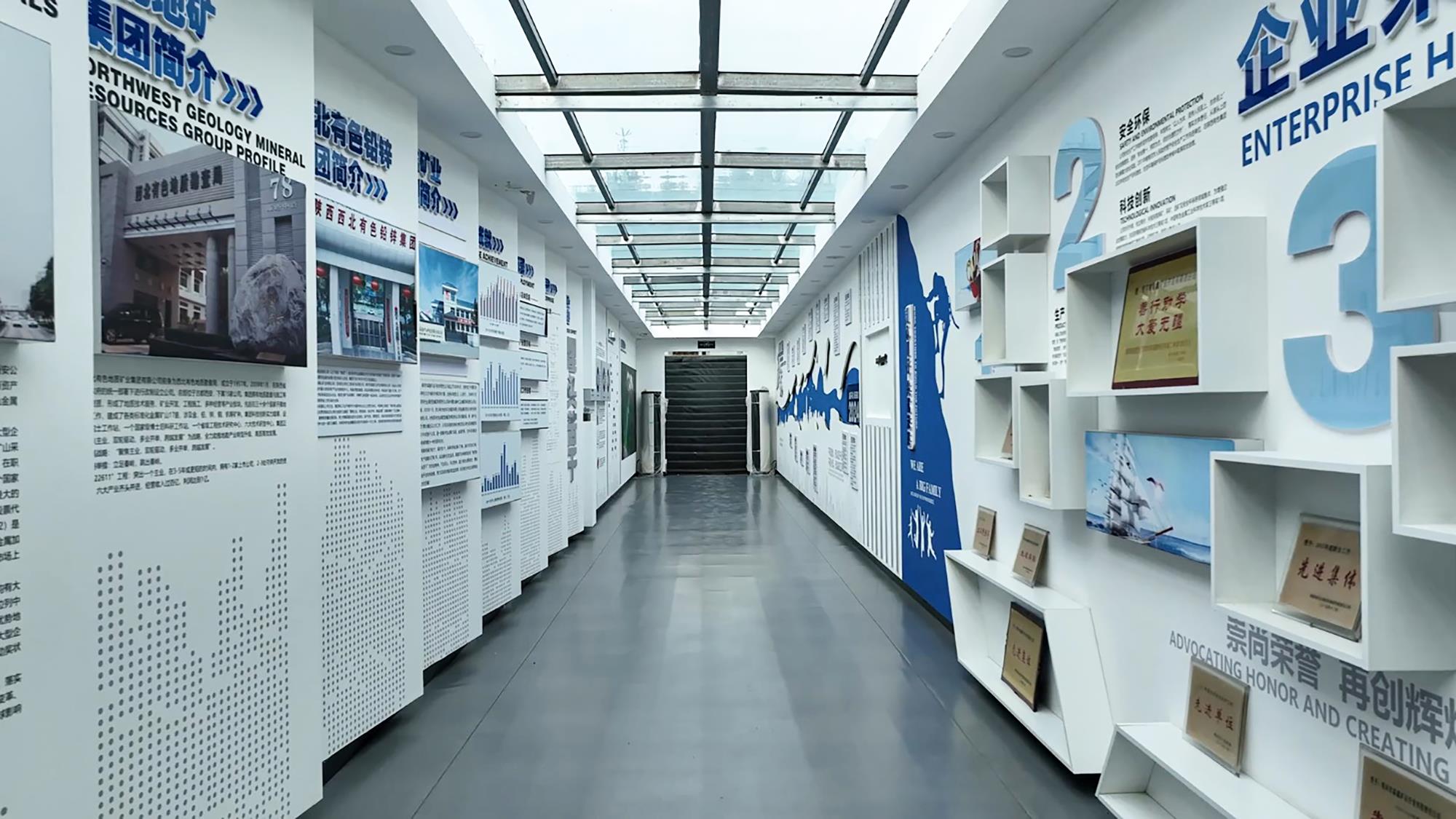 工程公司廊道文化充分吸收和融合了行業(yè)文化元素,“三光榮、四特別”地質(zhì)精神為廊道設(shè)計(jì)提供了豐富的靈感,一樓是企訓(xùn)宣傳欄,二樓分為企業(yè)愿景、價(jià)值觀、經(jīng)營理念、管理理念等8個(gè)模塊,三樓是人才理念和先進(jìn)人物事跡展,四樓是各產(chǎn)業(yè)板塊及重大典型工程案例,五樓是對文物保護(hù)特色產(chǎn)業(yè)的集中展示。每一塊展板都蘊(yùn)含著豐富的信息和深刻的啟示,方寸之間,文化盡顯。在森鑫礦業(yè)公司選礦廠二樓辦公區(qū),企業(yè)文化長廊的設(shè)計(jì)從礦山屬性出發(fā),以體現(xiàn)安全、專業(yè)、可靠的藍(lán)色為主色調(diào),各板塊使用了不規(guī)則圖形來表現(xiàn)內(nèi)容的個(gè)性化,避免了刻板的壓抑感,凸顯了公司積極向上的文化氛圍。同樣,在物化探總隊(duì)公司、研究院公司、717總隊(duì)公司、鉛鋅集團(tuán)本部和鳳縣分公司等單位,他們通過整合創(chuàng)新設(shè)計(jì),運(yùn)用每一塊展板、每一行文字、每一幅圖畫,把辦公區(qū)走廊、樓道、休息臺(tái)變成了回顧企業(yè)歷程、實(shí)施企務(wù)公開、展示技術(shù)成果、開展法治教育、宣介黨建品牌、倡導(dǎo)文明禮儀、弘揚(yáng)廉潔文化的藝術(shù)長廊。圖文并茂、靈活多樣的展陳形式,讓員工在駐足觀看學(xué)習(xí)的同時(shí),將企業(yè)文化理念內(nèi)化于心、外化于行。