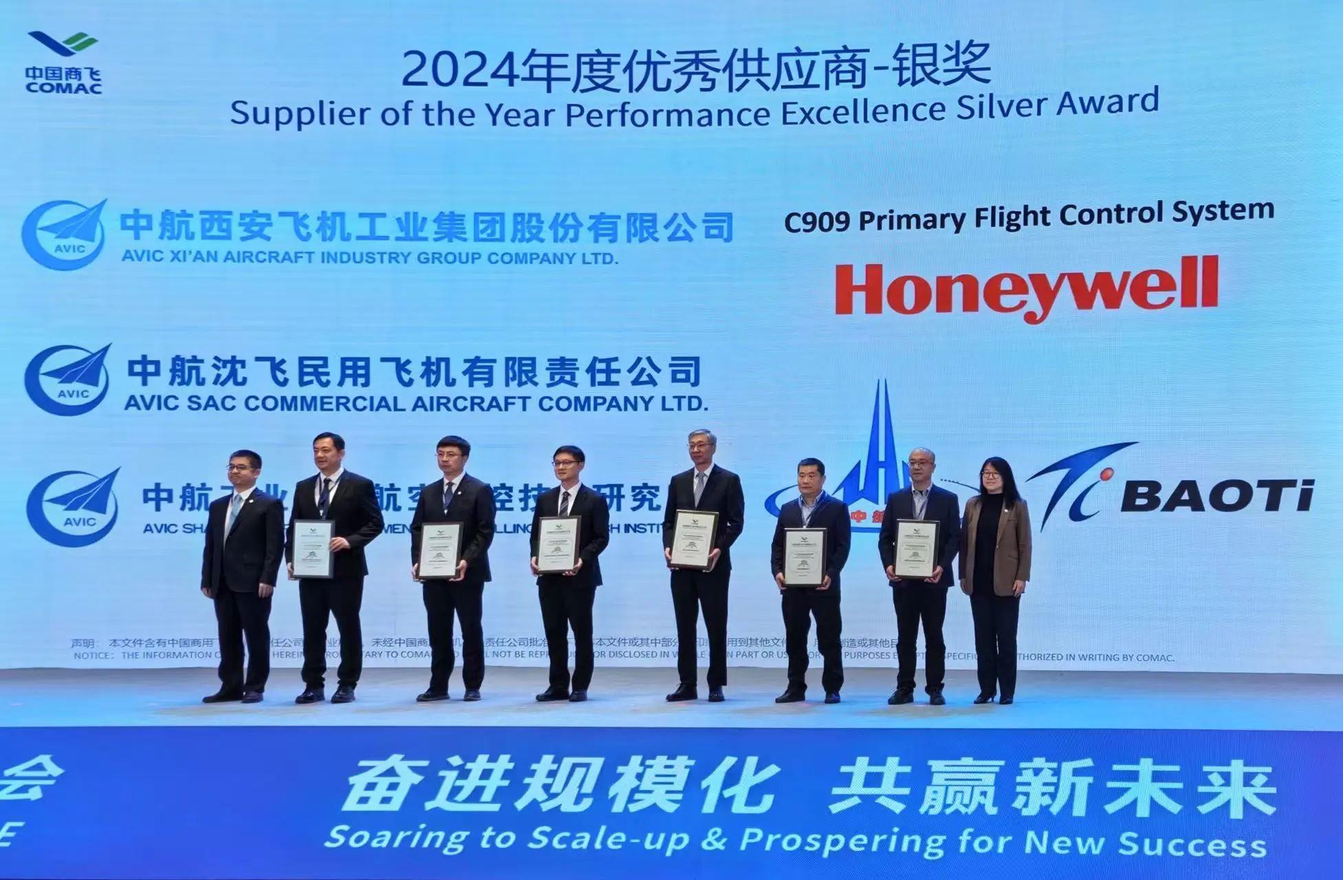 3月20日,中國商飛在西安召開2025年供應(yīng)商大會,來自全球229家供應(yīng)商的800余名代表共聚一堂,共話大飛機(jī)事業(yè)發(fā)展新篇章。會上,寶鈦股份憑借在鈦材研發(fā)、生產(chǎn)及供應(yīng)鏈保障中的卓越表現(xiàn),榮獲中國商飛“2024年度優(yōu)秀供應(yīng)商銀獎”,成為金屬材料領(lǐng)域獲此殊榮的少數(shù)企業(yè)之一。寶鈦股份總經(jīng)理陳戰(zhàn)乾代表企業(yè)登臺領(lǐng)獎。