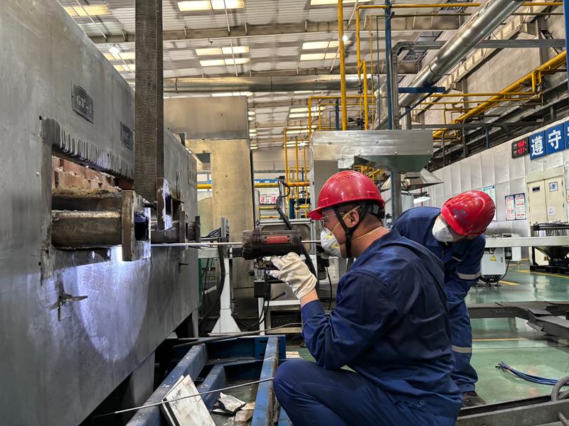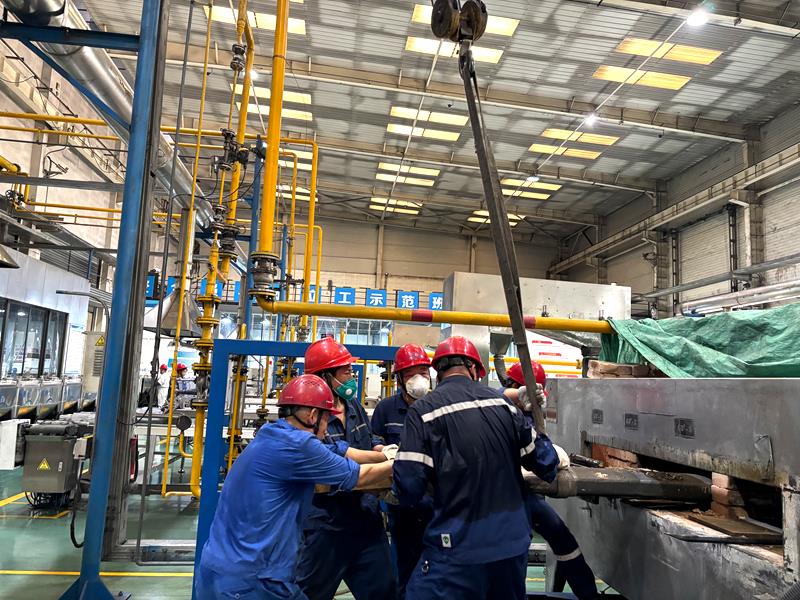 爐管更換是一項(xiàng)兼具繁重體力與精細(xì)技術(shù)的綜合性任務(wù),不僅需要拆卸爐管、徹底清理爐膛,還要精準(zhǔn)安裝新爐管并完成設(shè)備調(diào)試。既要克服重型部件搬運(yùn)的強(qiáng)度挑戰(zhàn),又需要確保每一步裝配的毫米級精度,最終實(shí)現(xiàn)設(shè)備高效穩(wěn)定運(yùn)行。在悶熱如蒸籠的作業(yè)環(huán)境中,員工們揮汗如雨,卻始終斗志昂揚(yáng)。“雖然天氣熱,但生產(chǎn)任務(wù)不能耽誤,我們早一分鐘完成,后續(xù)生產(chǎn)就多一份保障!”員工樸實(shí)的話語詮釋了鉬粉分廠員工的責(zé)任與擔(dān)當(dāng)。