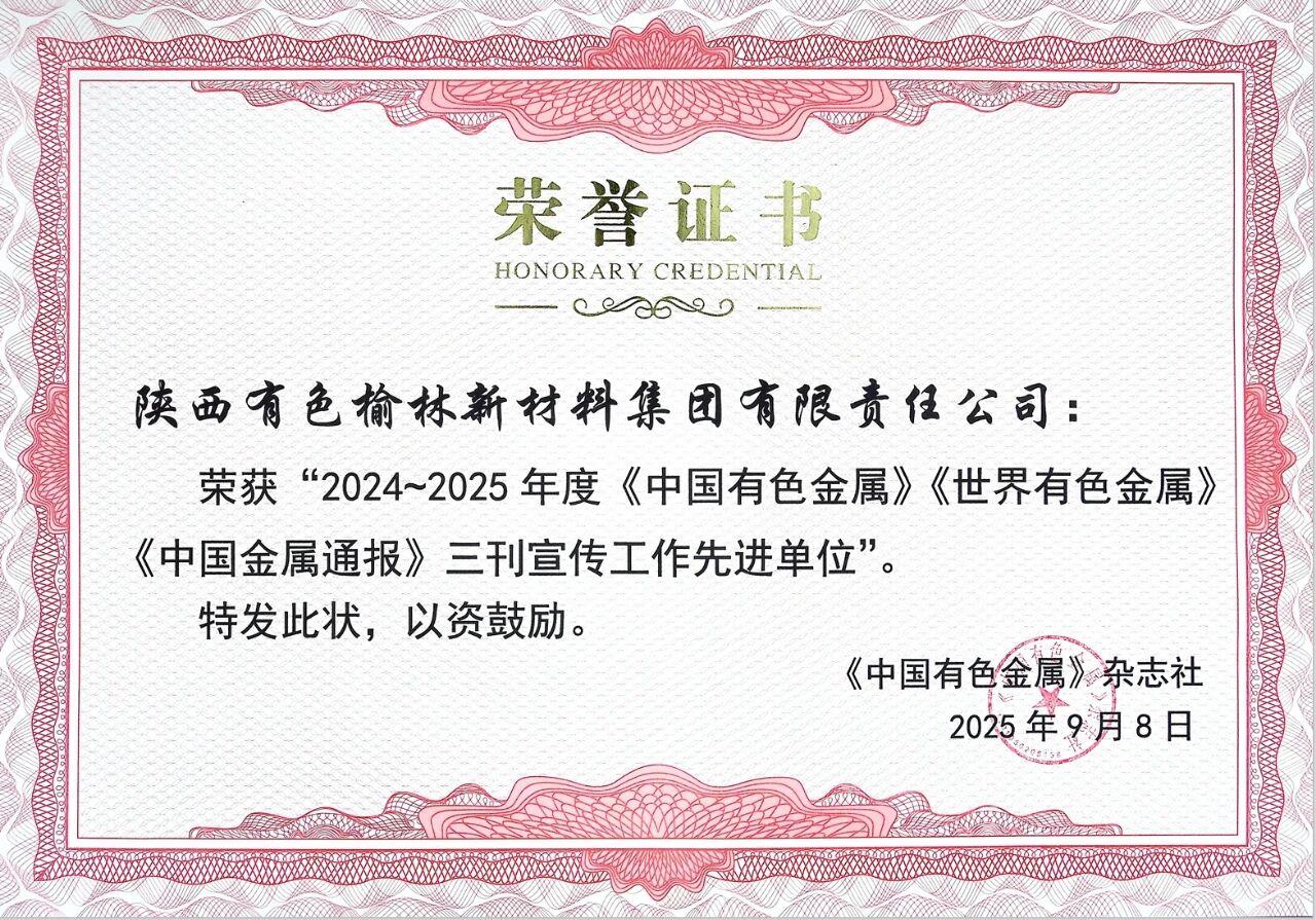近日,從《中國有色金屬》《世界有色金屬》《中國金屬通報》三刊特約通訊員、《中國有色金屬工業(yè)年鑒》撰稿人工作會上獲悉,榆林新材料集團以優(yōu)異的宣傳工作成效,榮獲2024-2025年度《中國有色金屬》雜志社三刊宣傳工作先進單位。