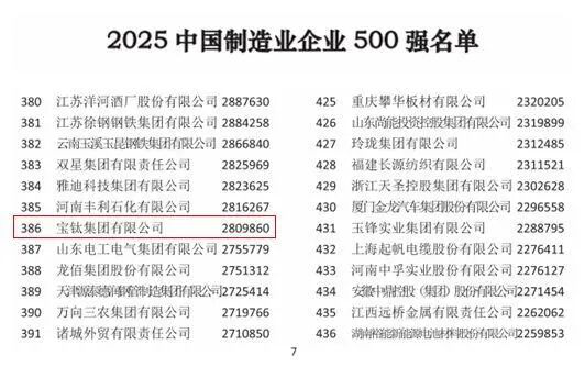 近日,2025世界制造業(yè)大會(huì)在合肥舉辦。會(huì)議發(fā)布了“2025中國(guó)制造業(yè)企業(yè)500強(qiáng)”榜單,寶鈦集團(tuán)首次榮登“中國(guó)制造業(yè)企業(yè)500強(qiáng)”,位列386位,彰顯出了較強(qiáng)的綜合實(shí)力和強(qiáng)勁的發(fā)展勢(shì)頭。