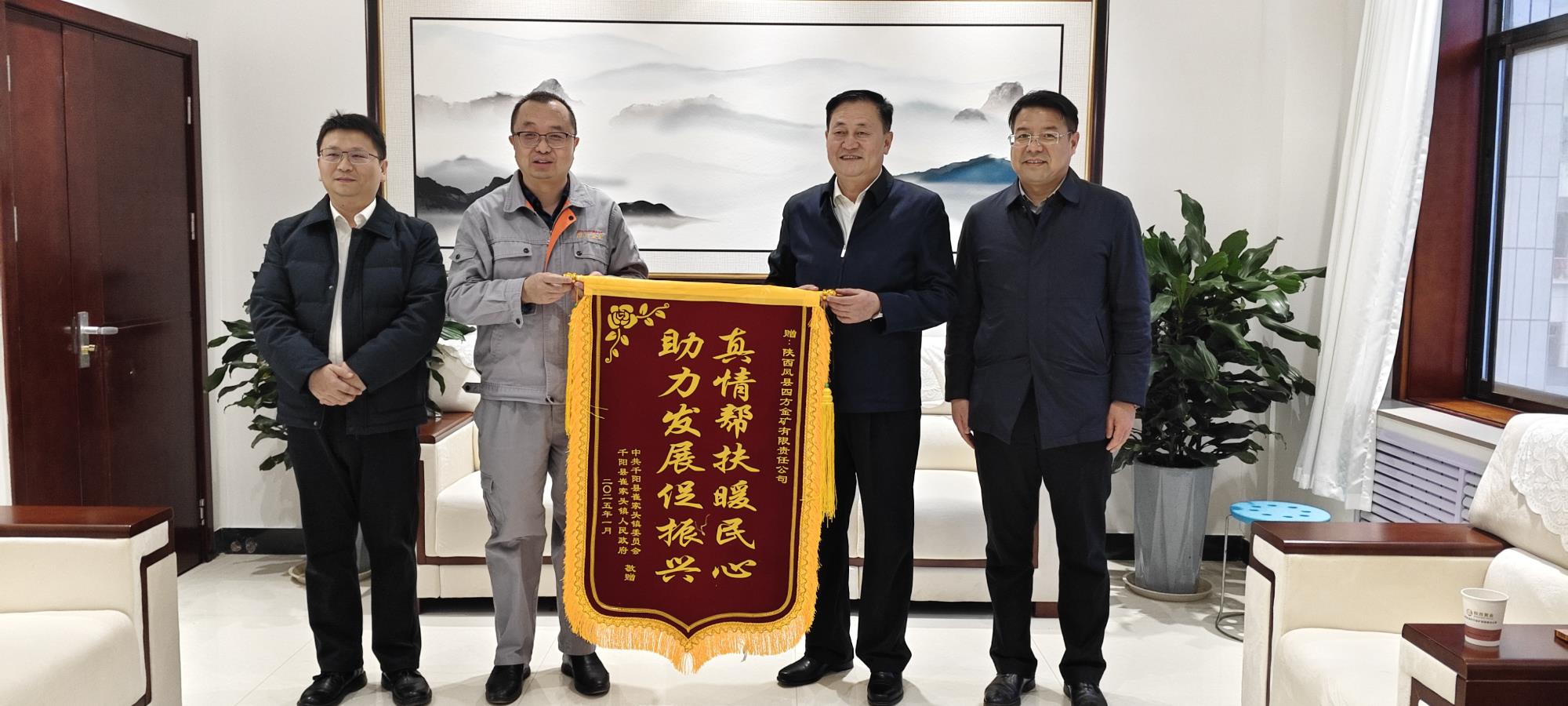 1月7日,寶雞市千陽縣縣委常委、副縣長何紅軍,副縣長李弦一行到黃金集團四方金礦座談交流,深化政企合作。千陽縣領(lǐng)導(dǎo)對四方金礦駐村幫扶工作成效給予高度肯定,向公司贈予了“真情幫扶暖民心 助力發(fā)展促振興”錦旗。